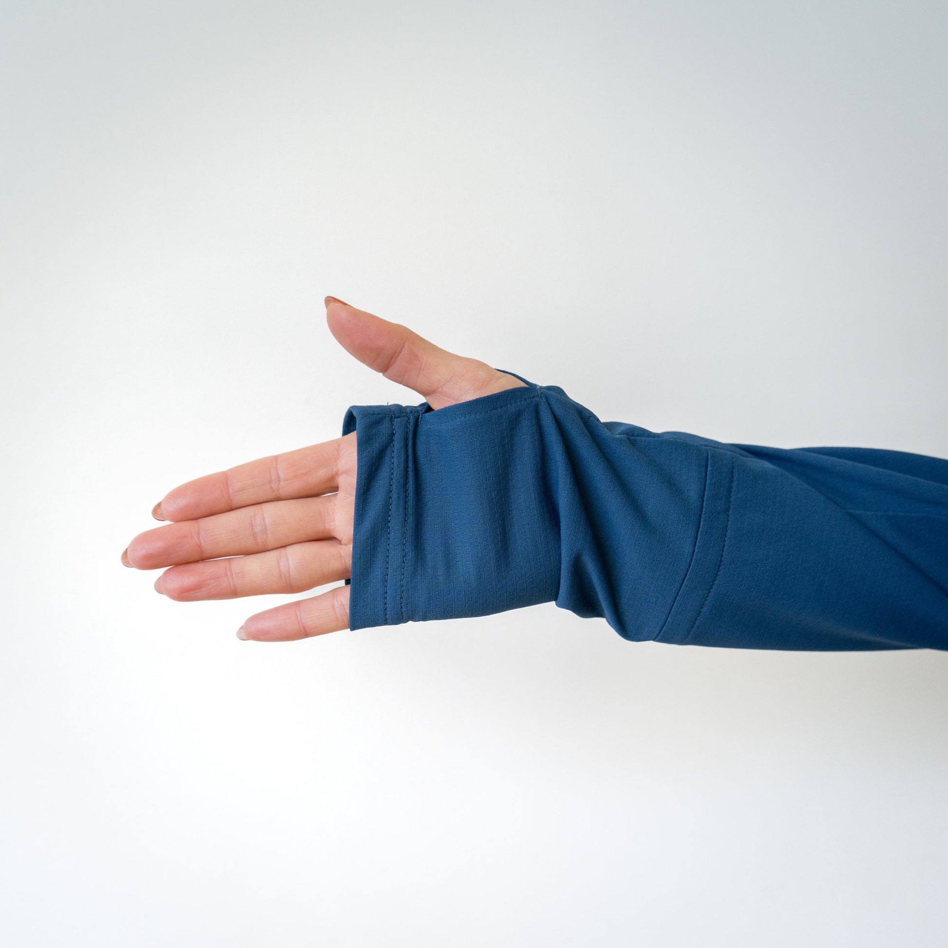 UPF25の紫外線カット機能を備え、腕全体をしっかりとカバー。さらにサムホールにより手の甲まで覆うことで、日差しから肌を守りながら、余計な体力消耗を抑えます。