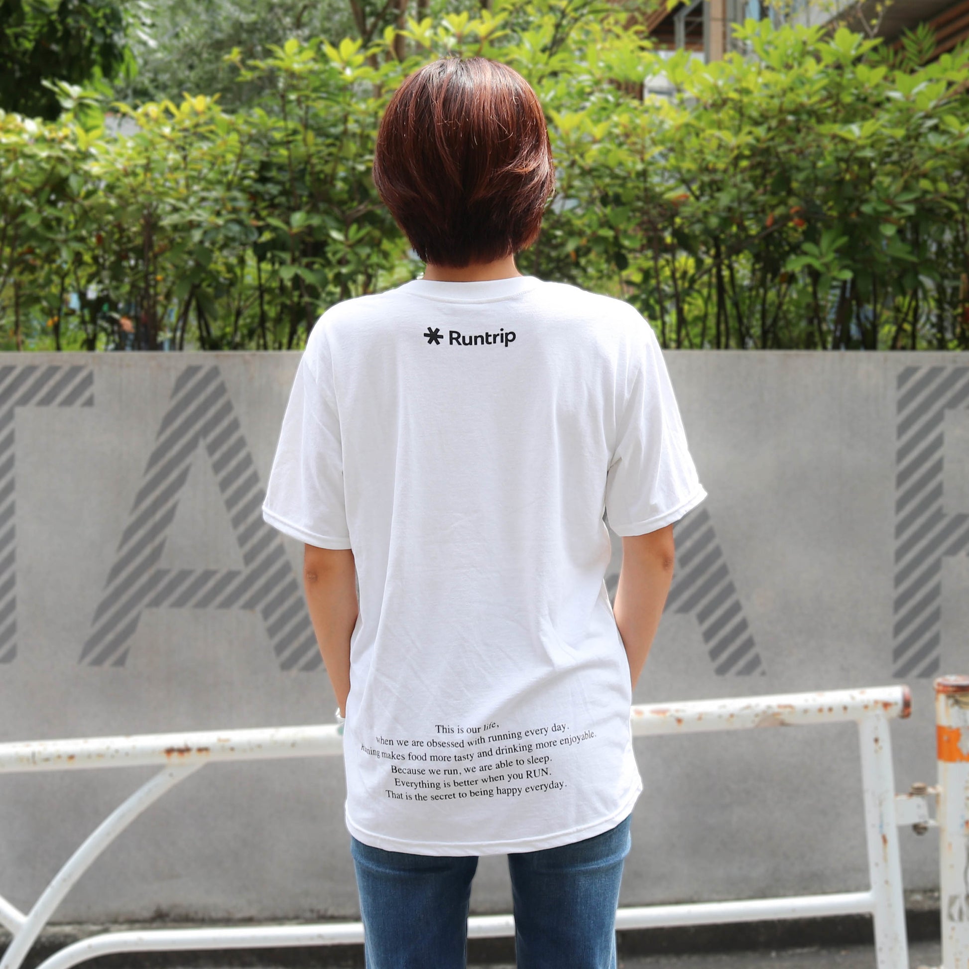 The new design for 2023 boldly expands the elements of EAT, DRINK, SLEEP, and RUN, and arranges them vertically to create a design that mixes message and fashion. The last word, "RUN," is emphasized as if it were drawn with a marker. In addition, the Runtrip logo is printed on the back of the neck as a symbol of "a world where you can run more freely and enjoyably," and the concept message of this brand line is printed on the bottom of the back.