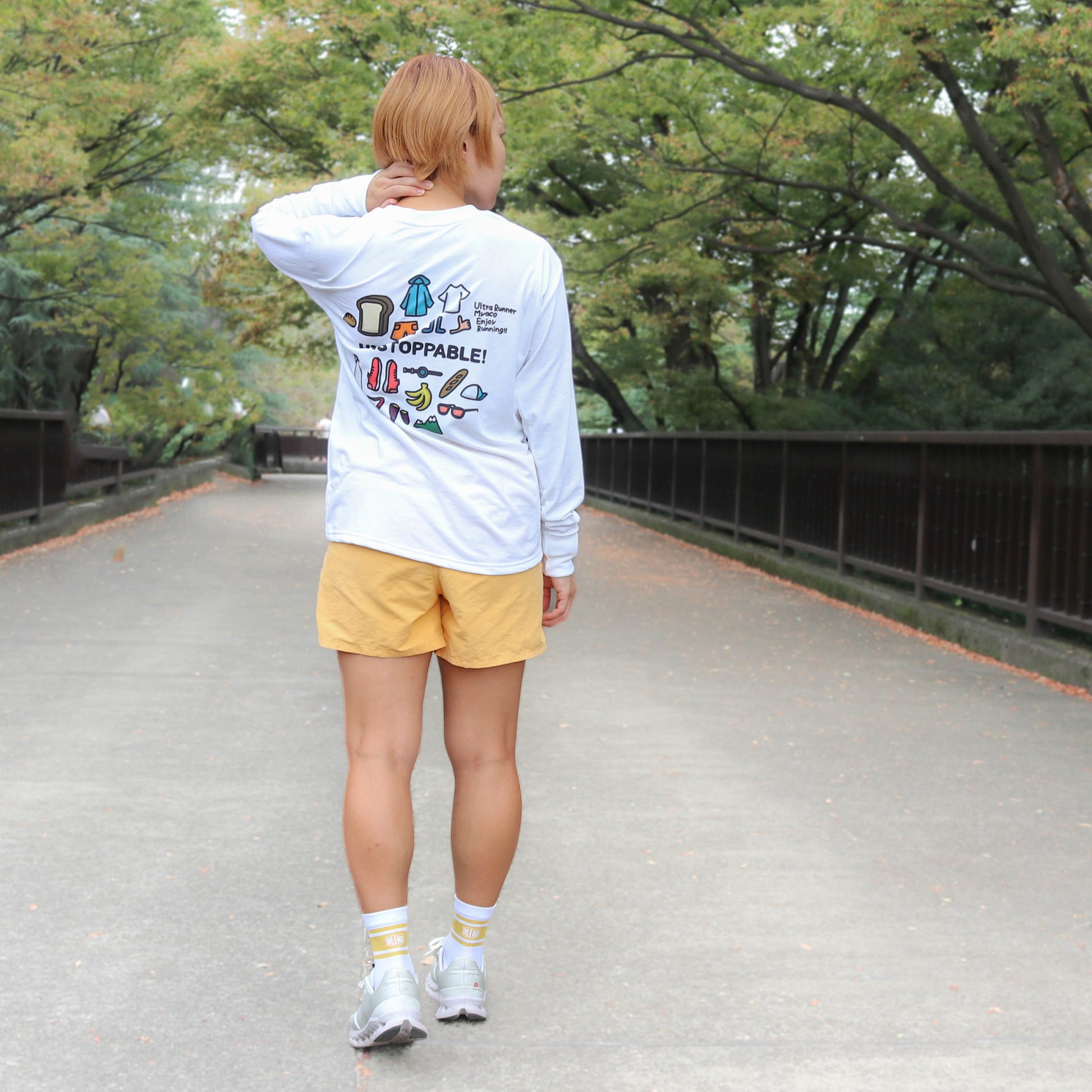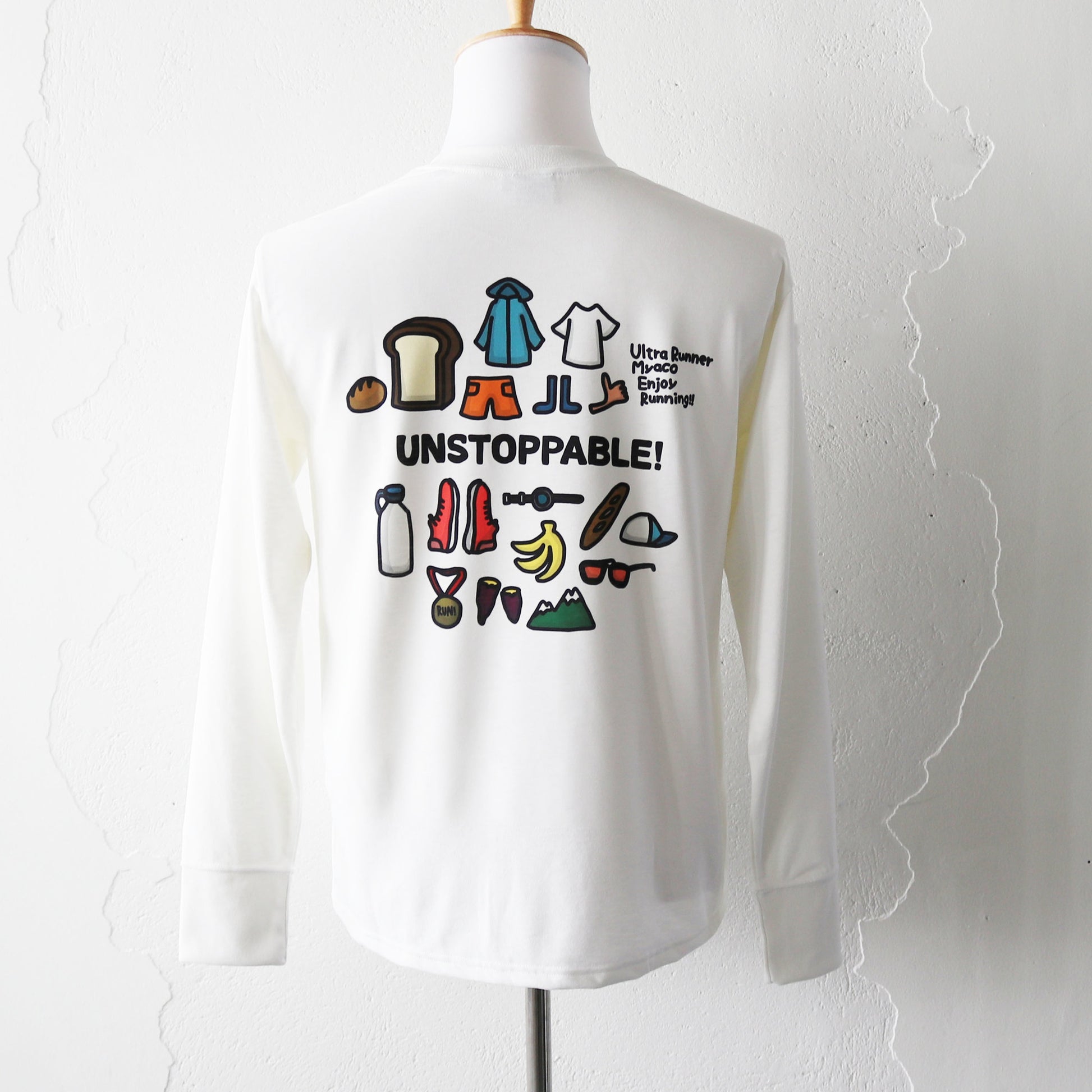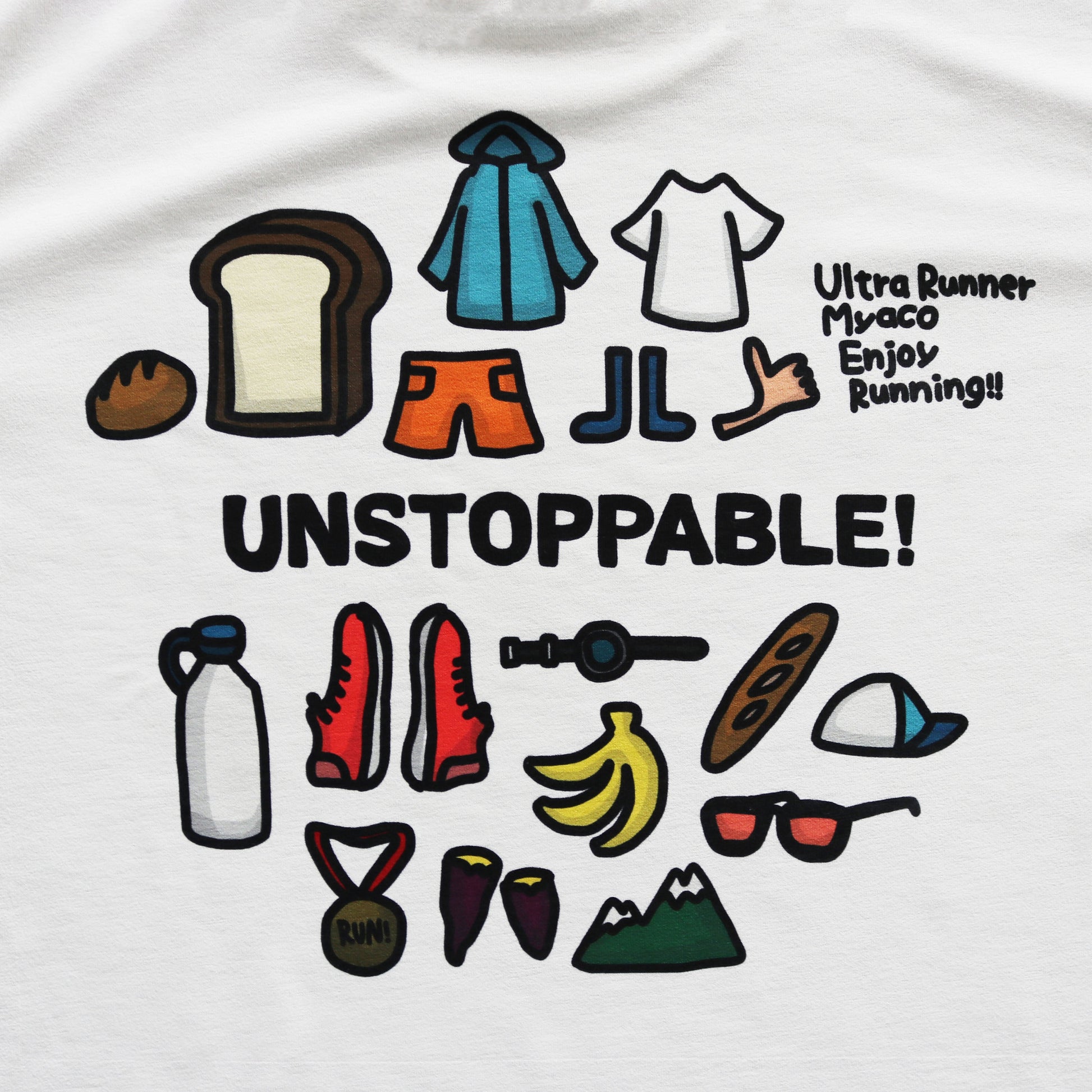The back print shows the things I love, the things that excite me, and the things that are essential to running. The word "UNSTOPPABLE" written in the middle means "It's so fun I don't want to stop!" and "I want to keep running!"