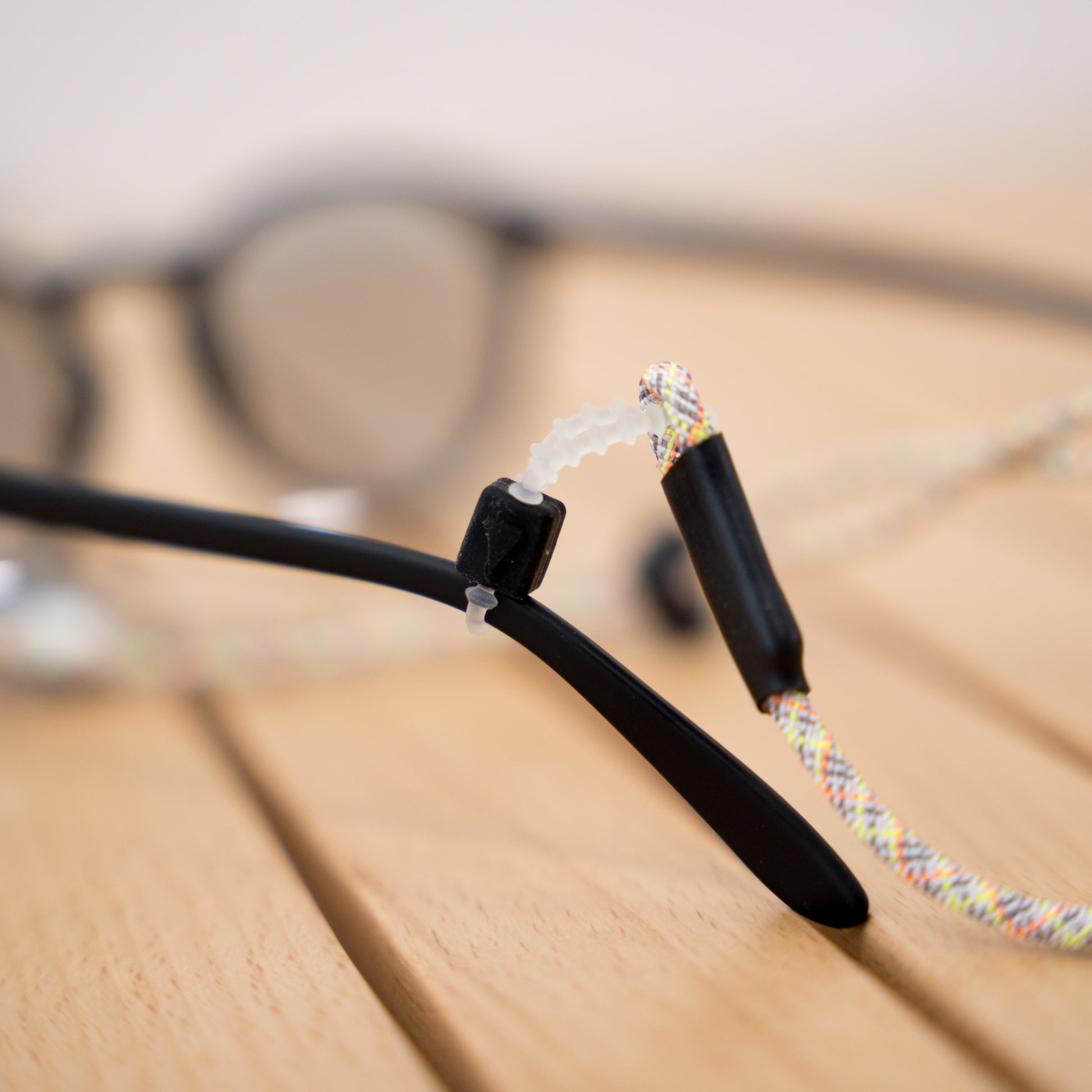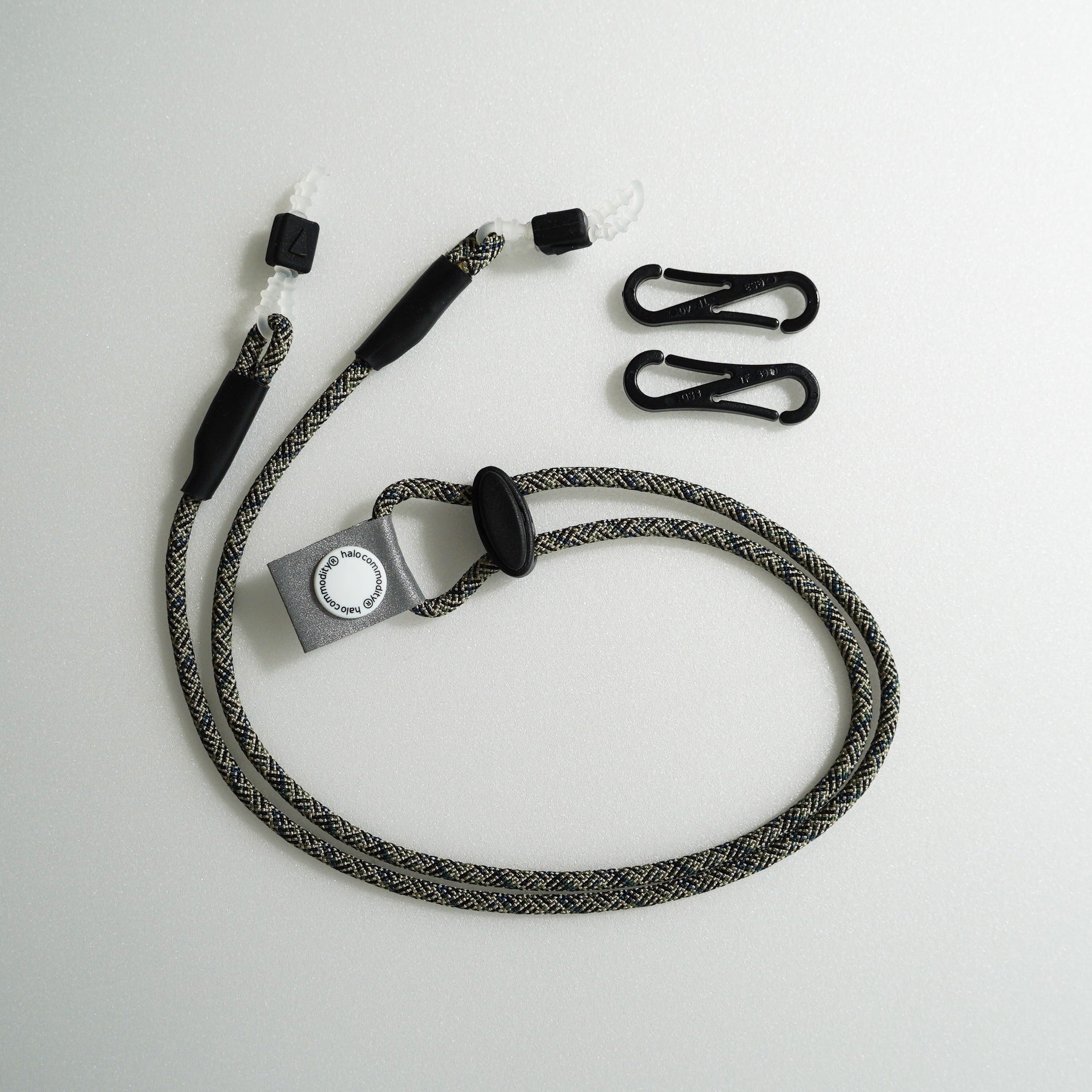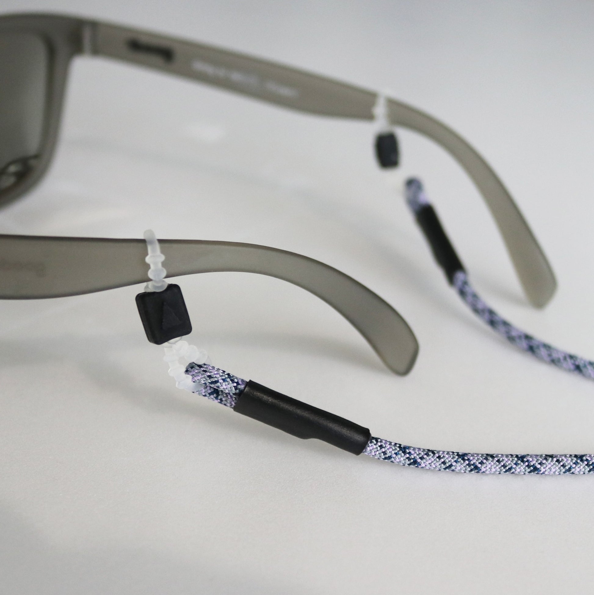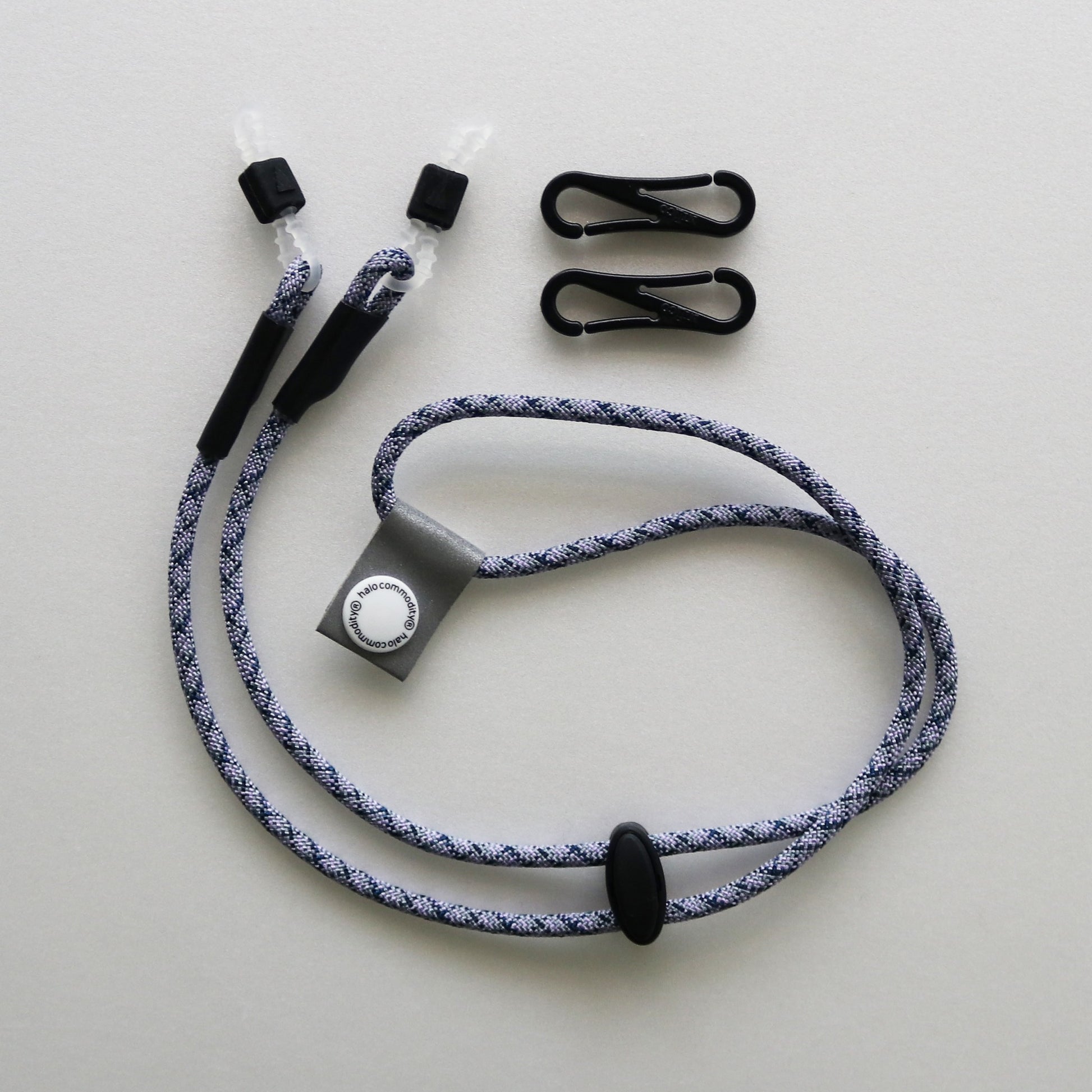 The parts that attach to the temples of glasses and sunglasses are also original to Halo Commodity and have been reinforced for durability. They can be adjusted to fit temples of various thicknesses.