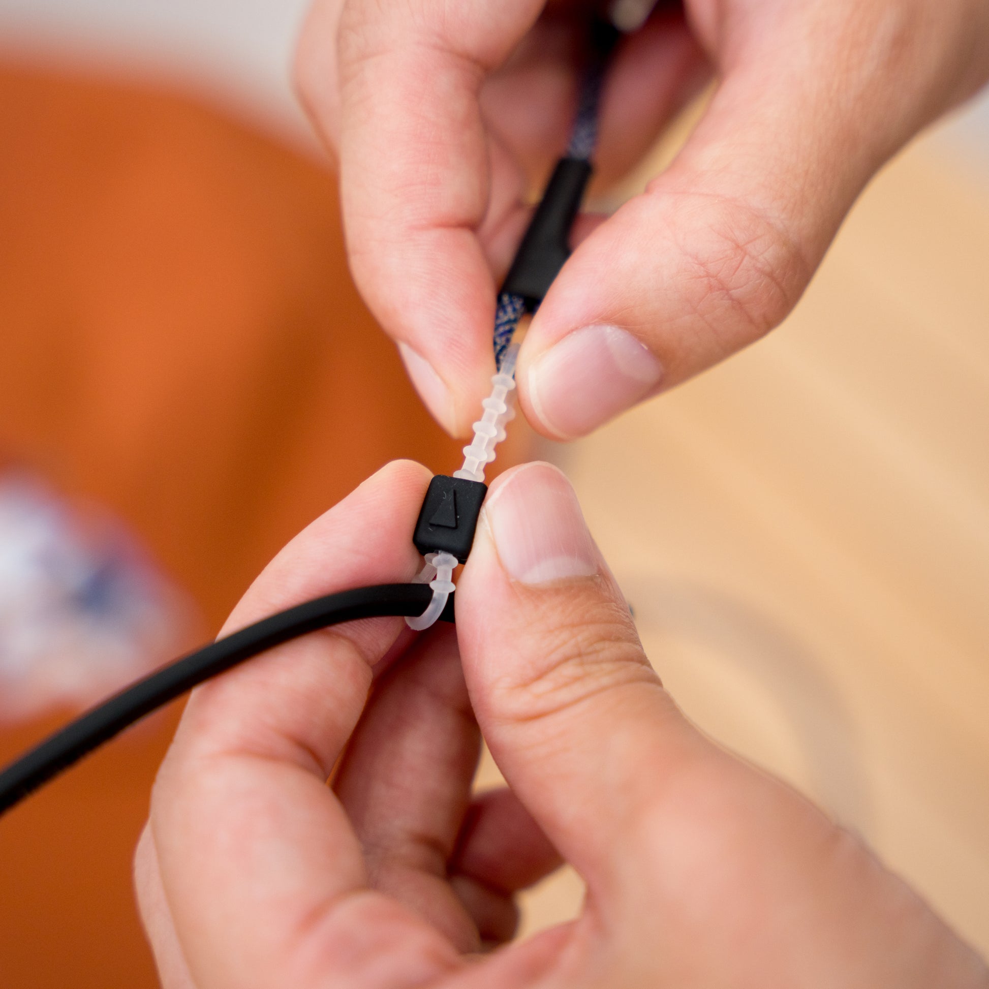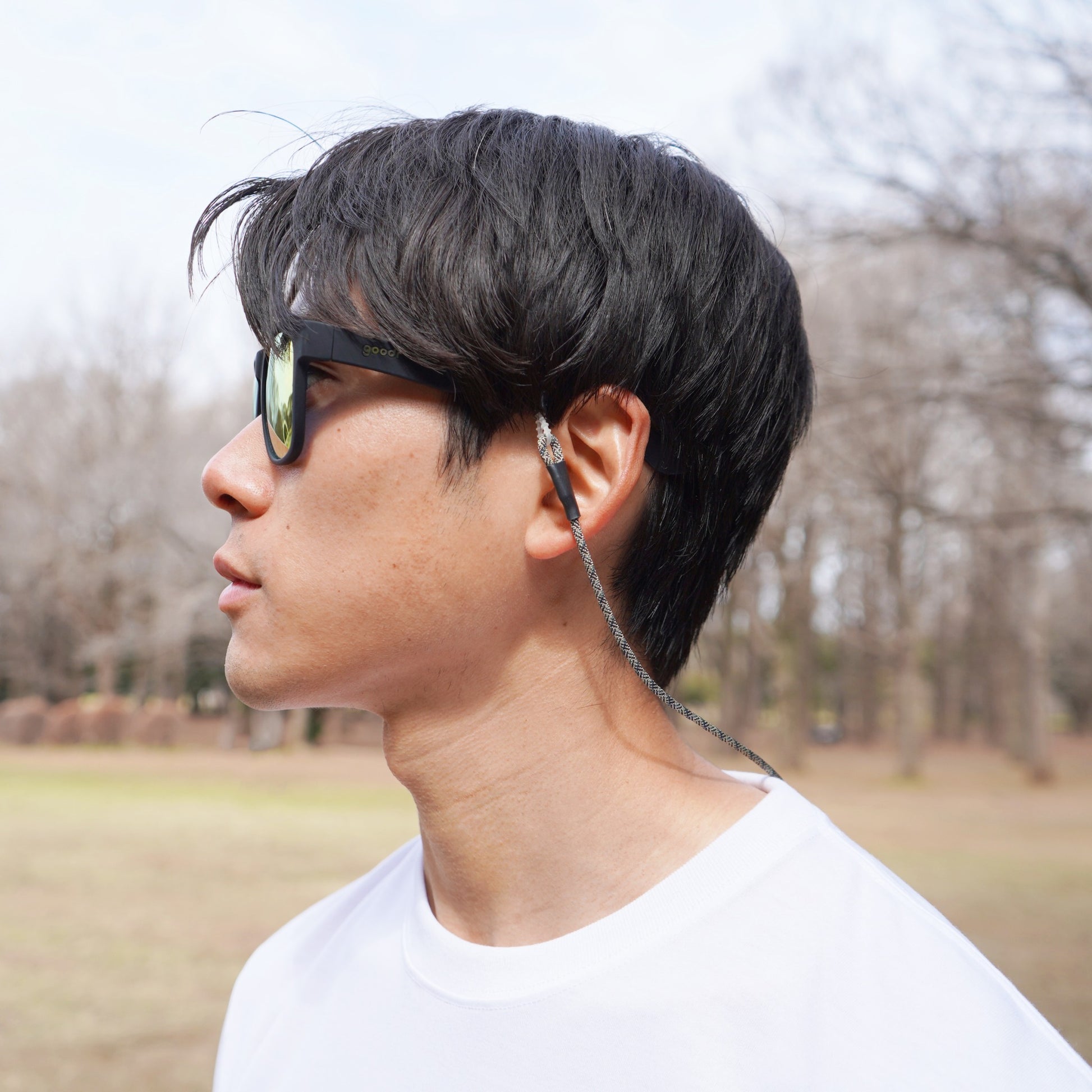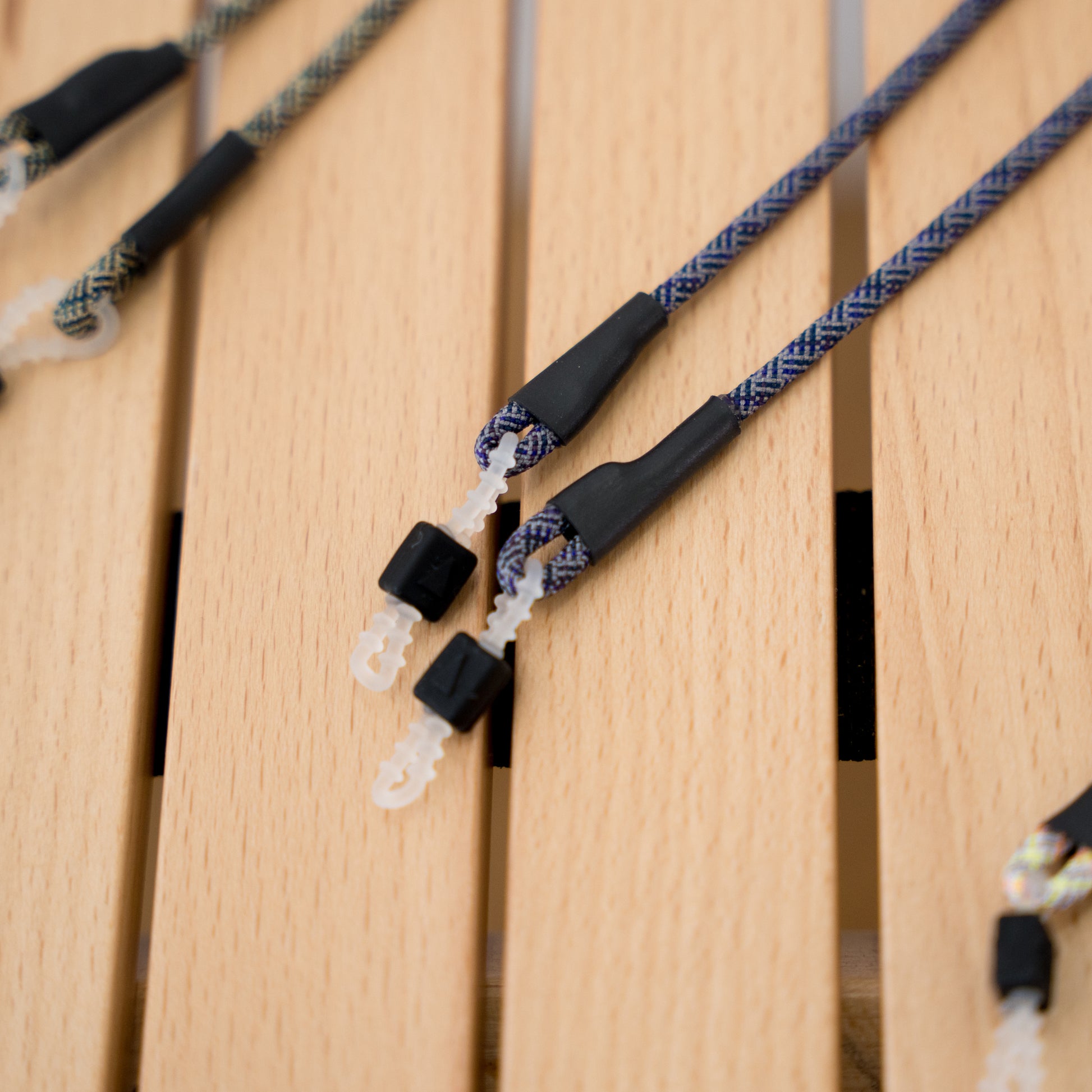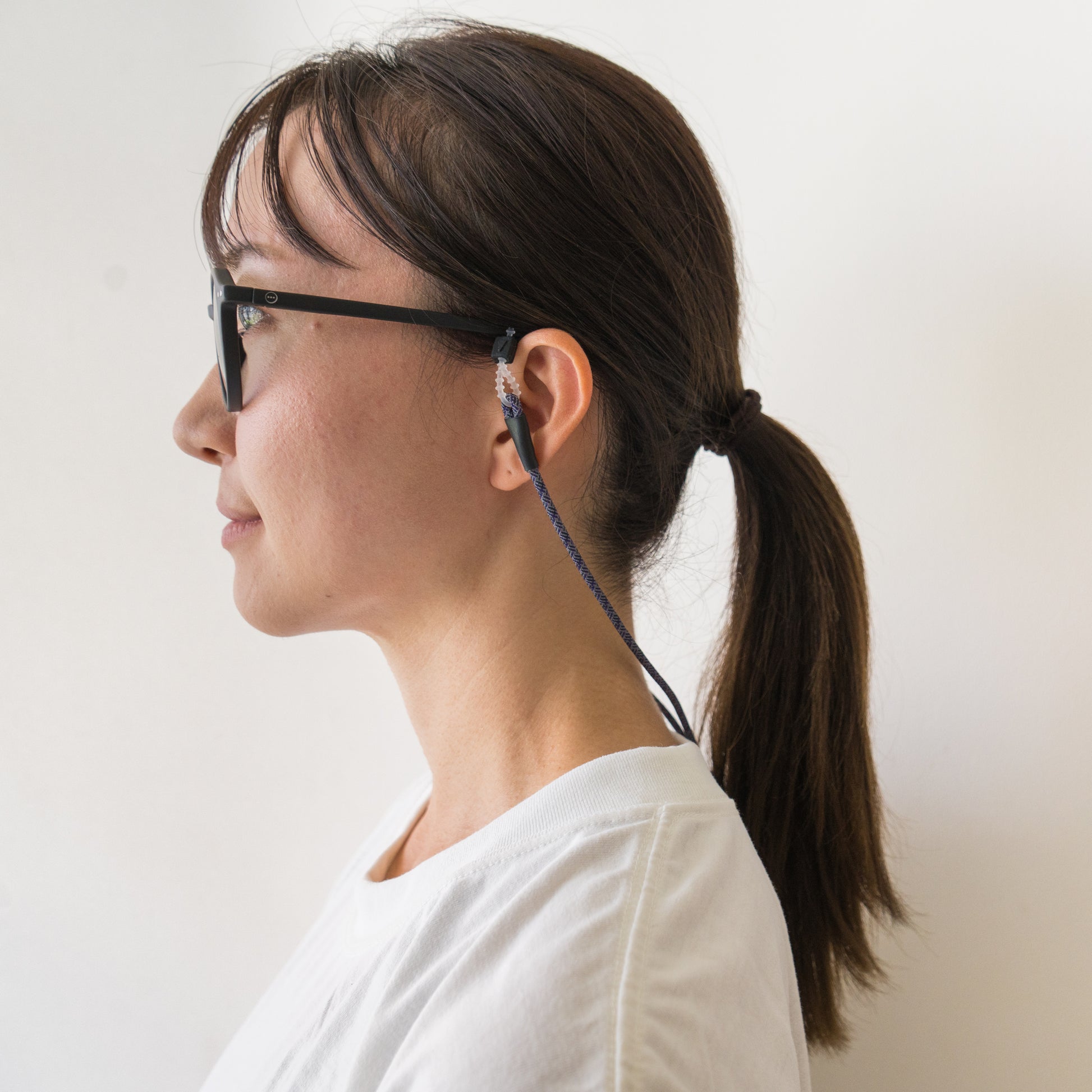 The parts that attach to the temples of glasses and sunglasses are also original to Halo Commodity and have been reinforced for durability. They can be adjusted to fit temples of various thicknesses.