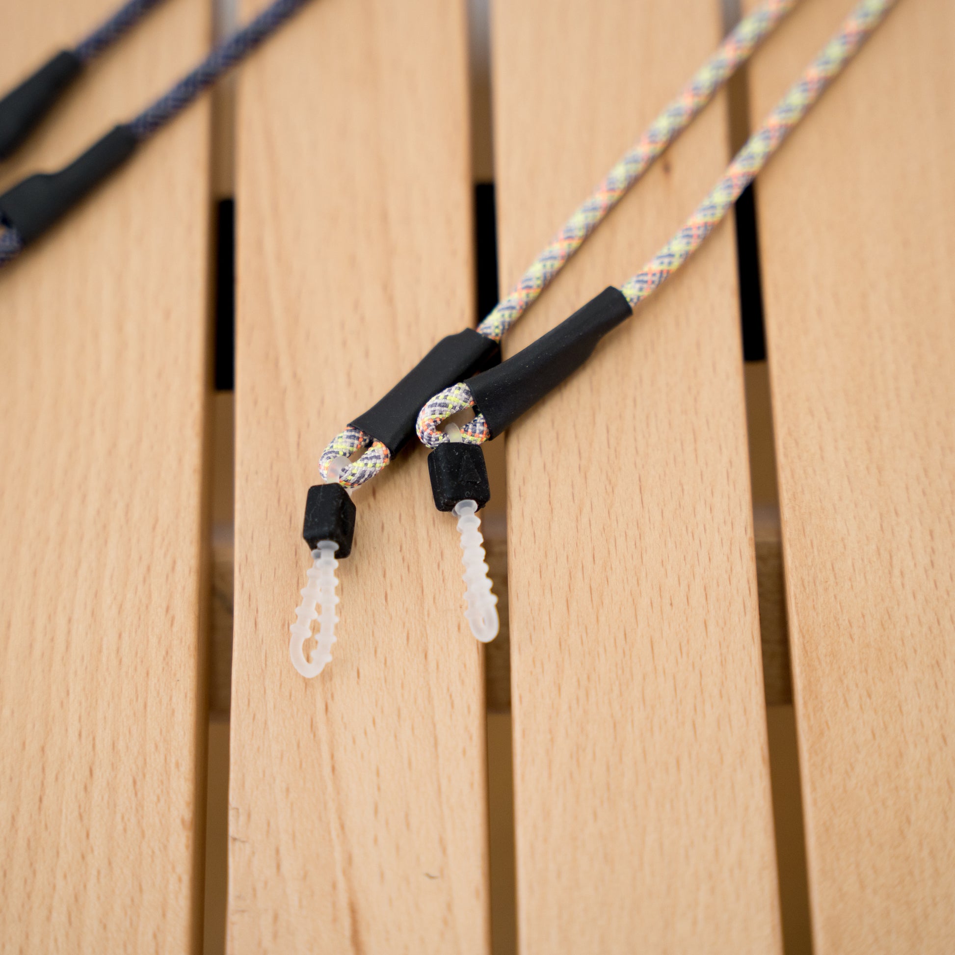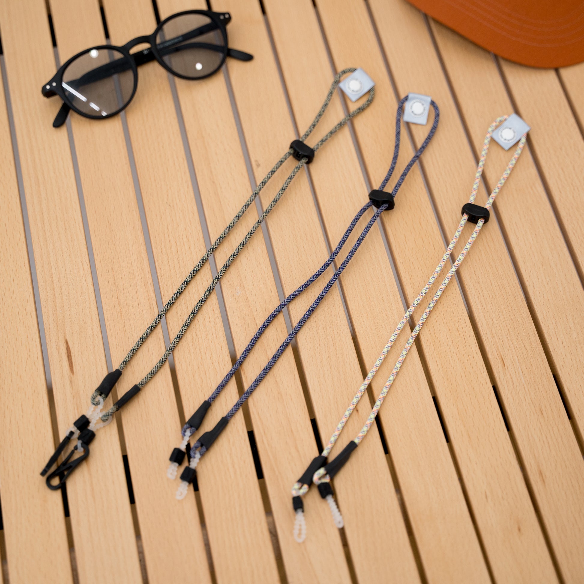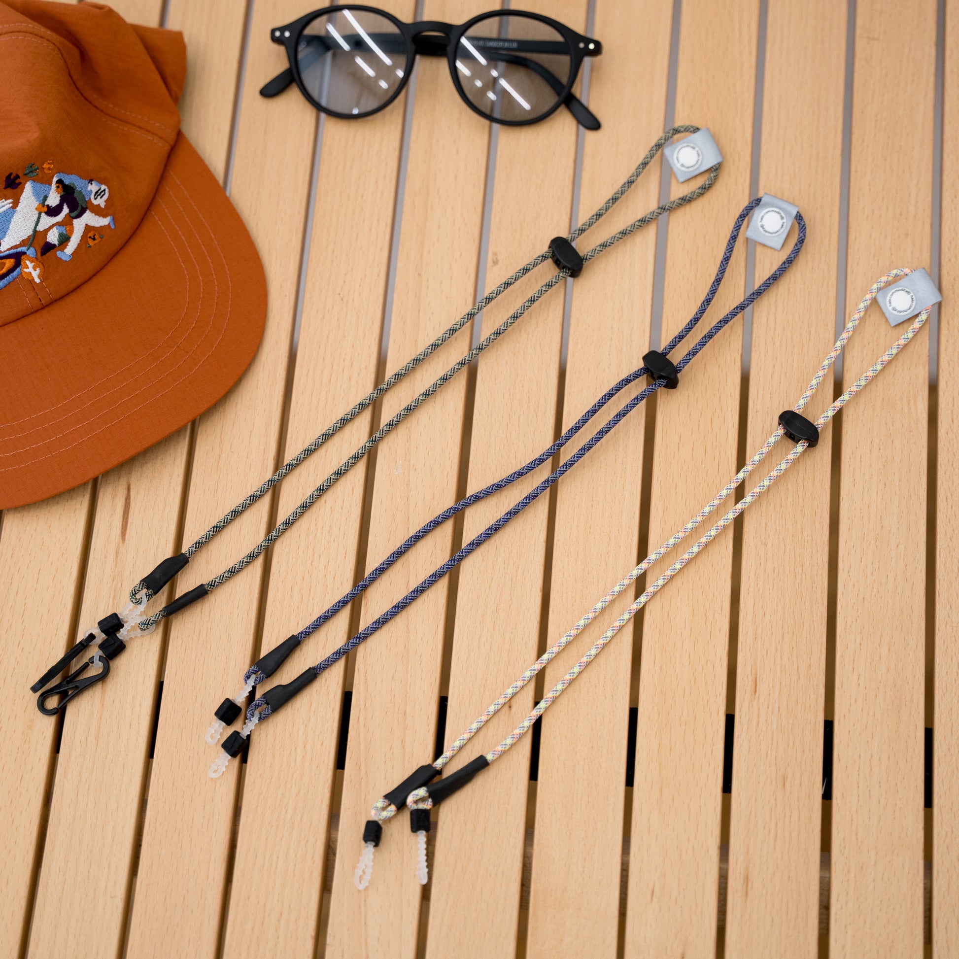 Braided chin strap and glasses cord made by halo commodity in original colors. Not only does it prevent the glasses from falling out, but it also adds a colorful accent to your outfit.
