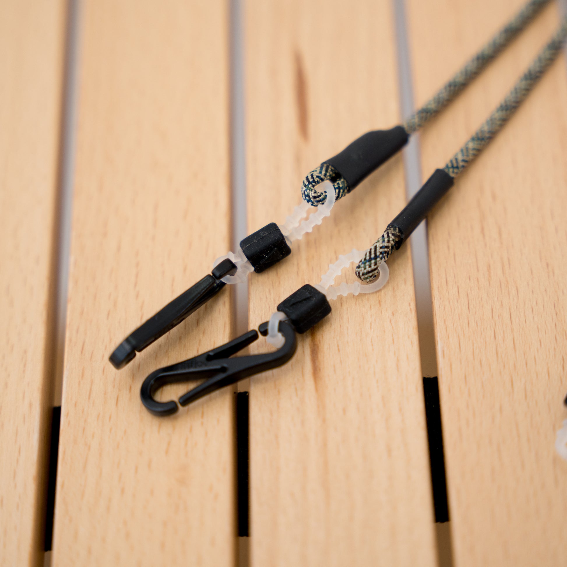 When using it as a glasses cord, remove the hook and pass the silicone part through your sunglasses as shown in the image, then adjust it to fit your sunglasses.