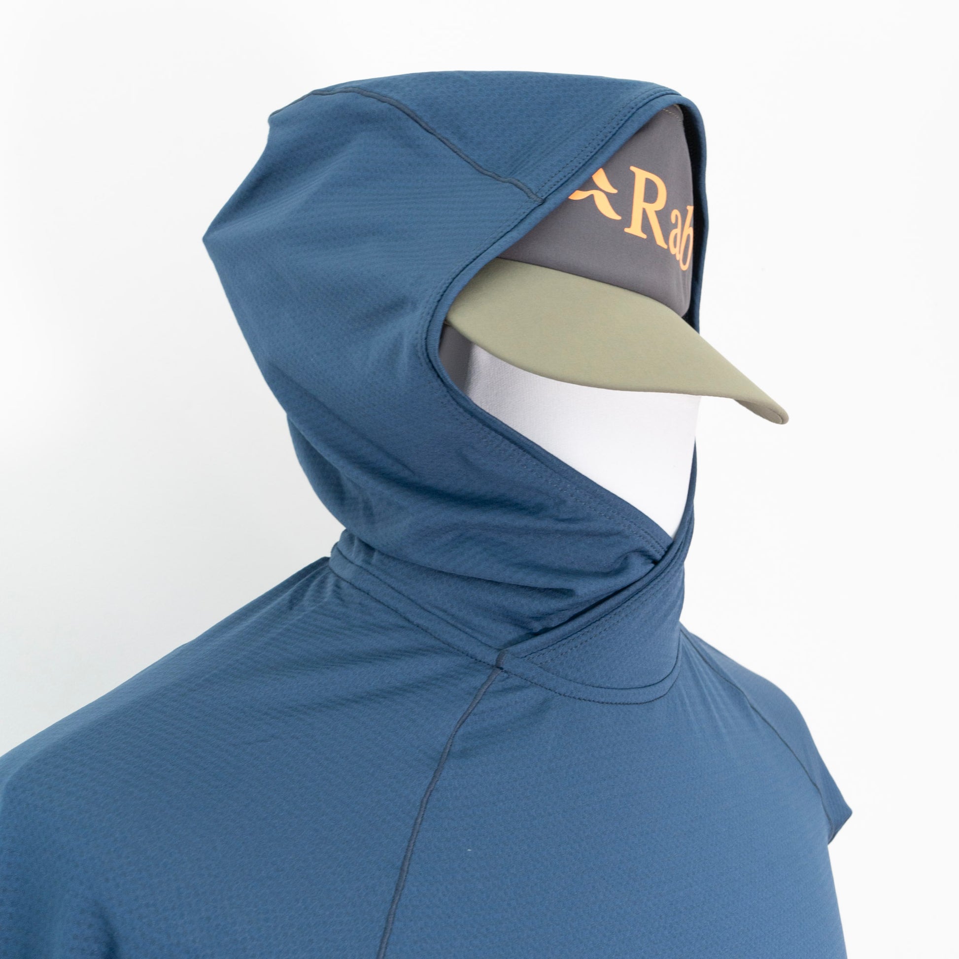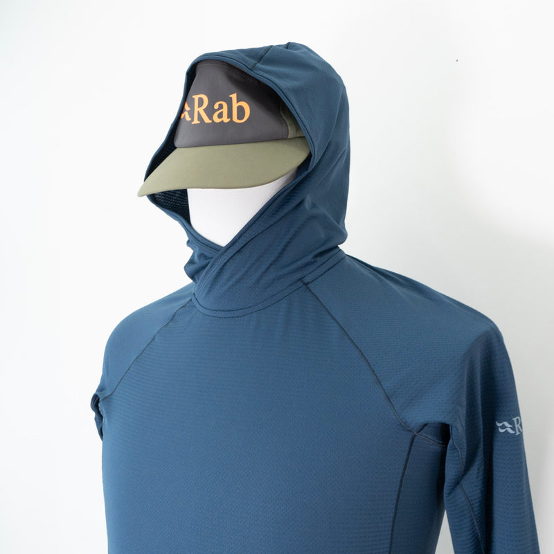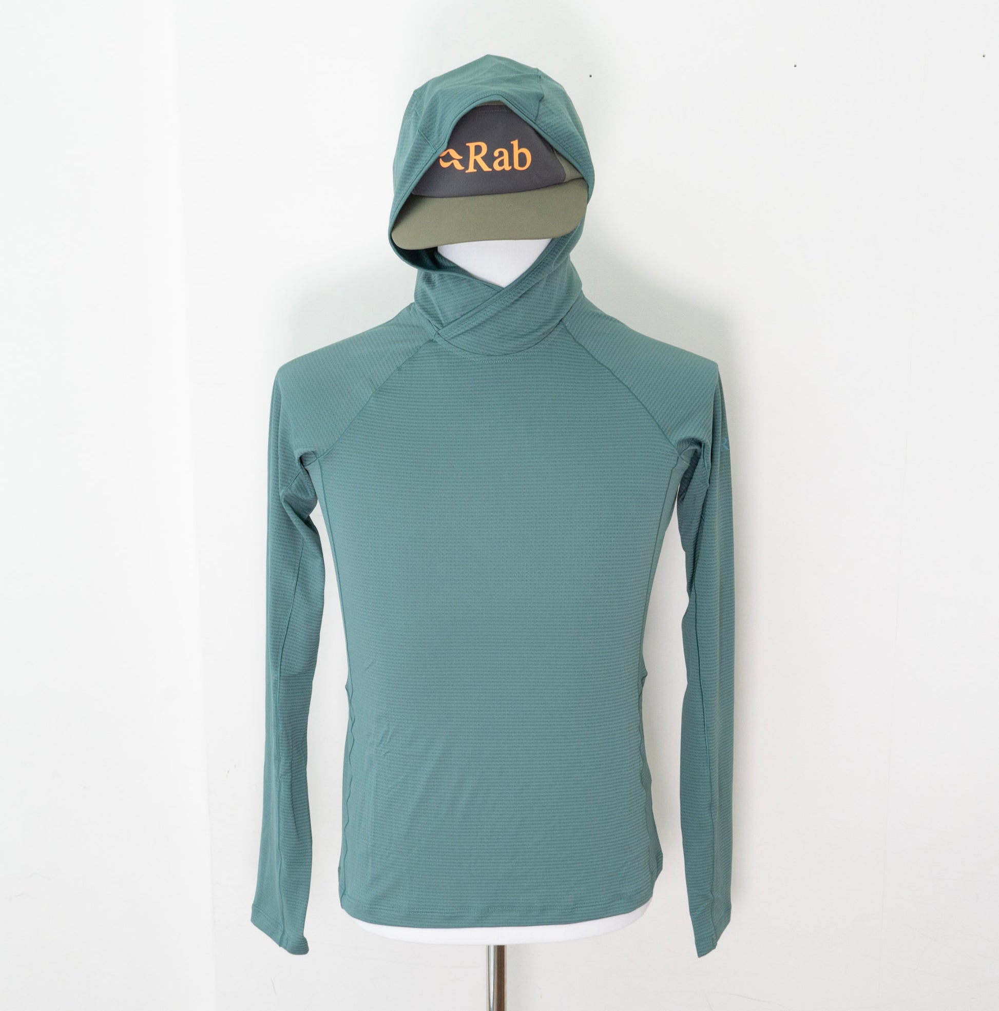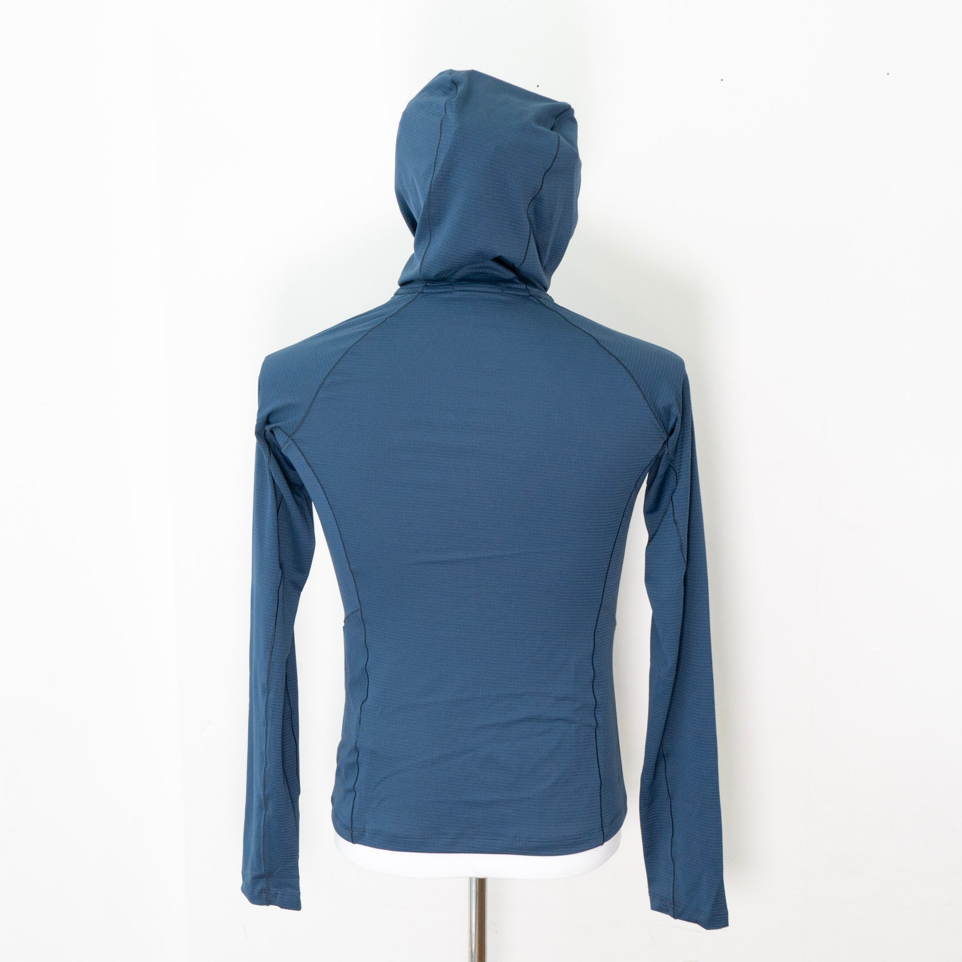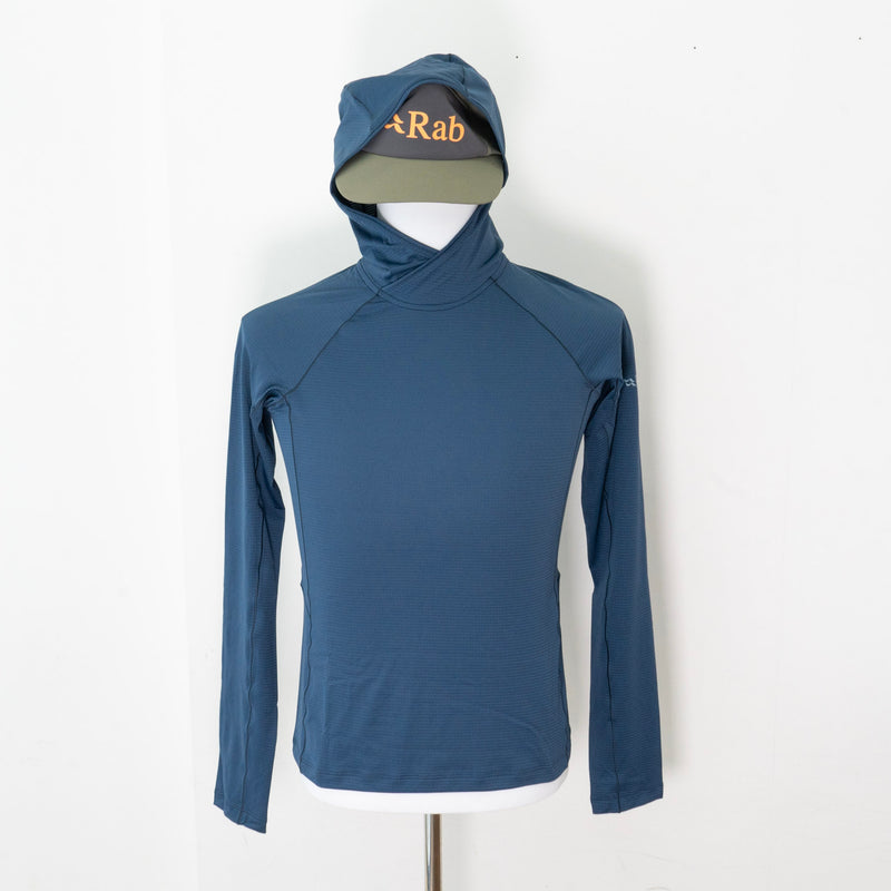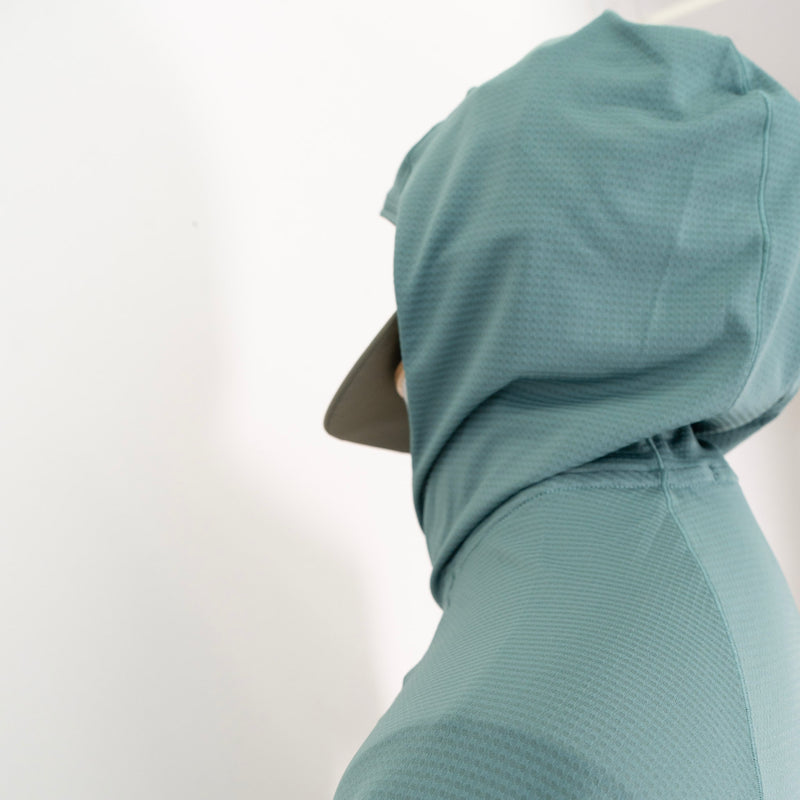 1枚で着用しても良し、、伸縮性が高いのでミドルレイヤーとして使うこともできるフード付きベースレイヤーは1枚持っておくと万能なアイテム。