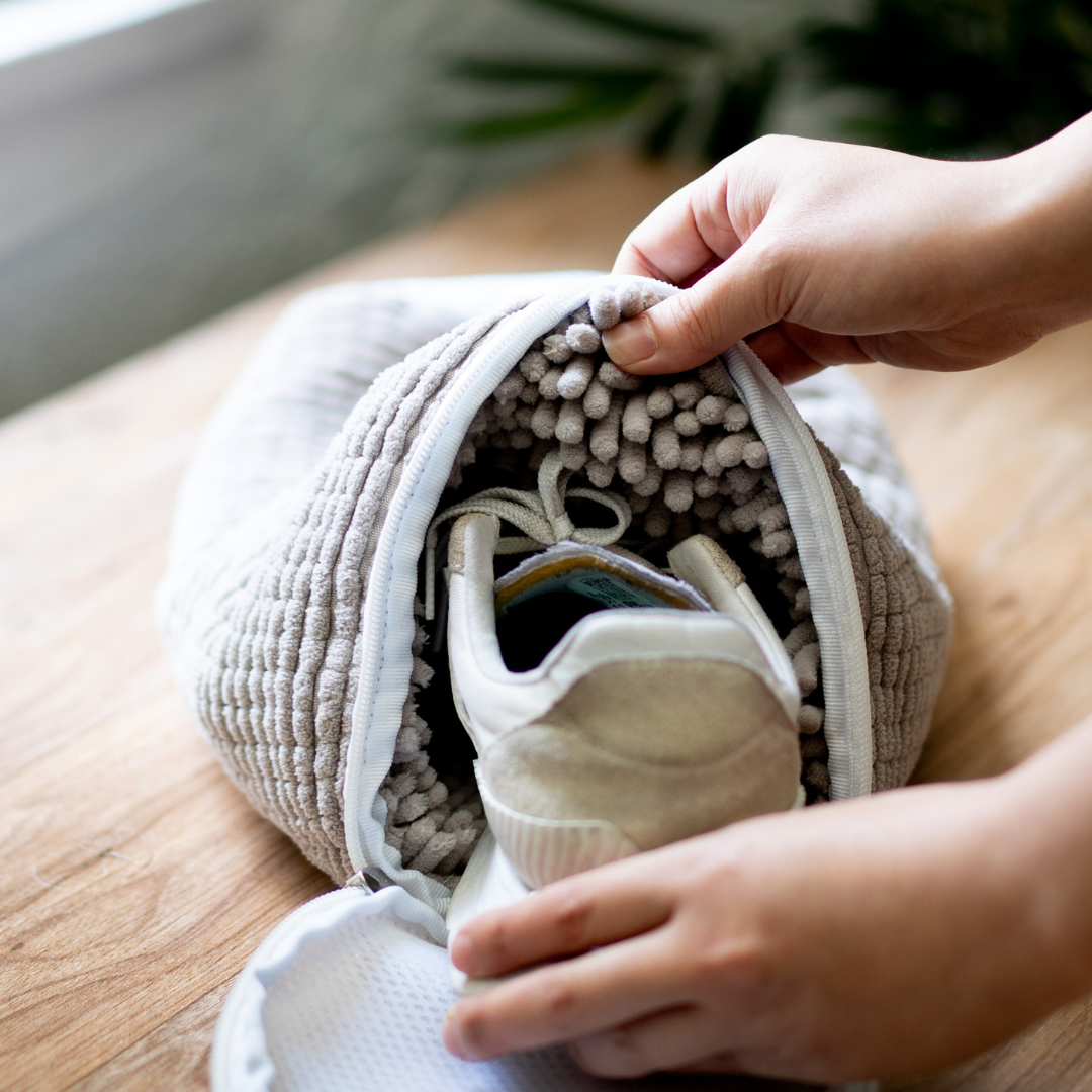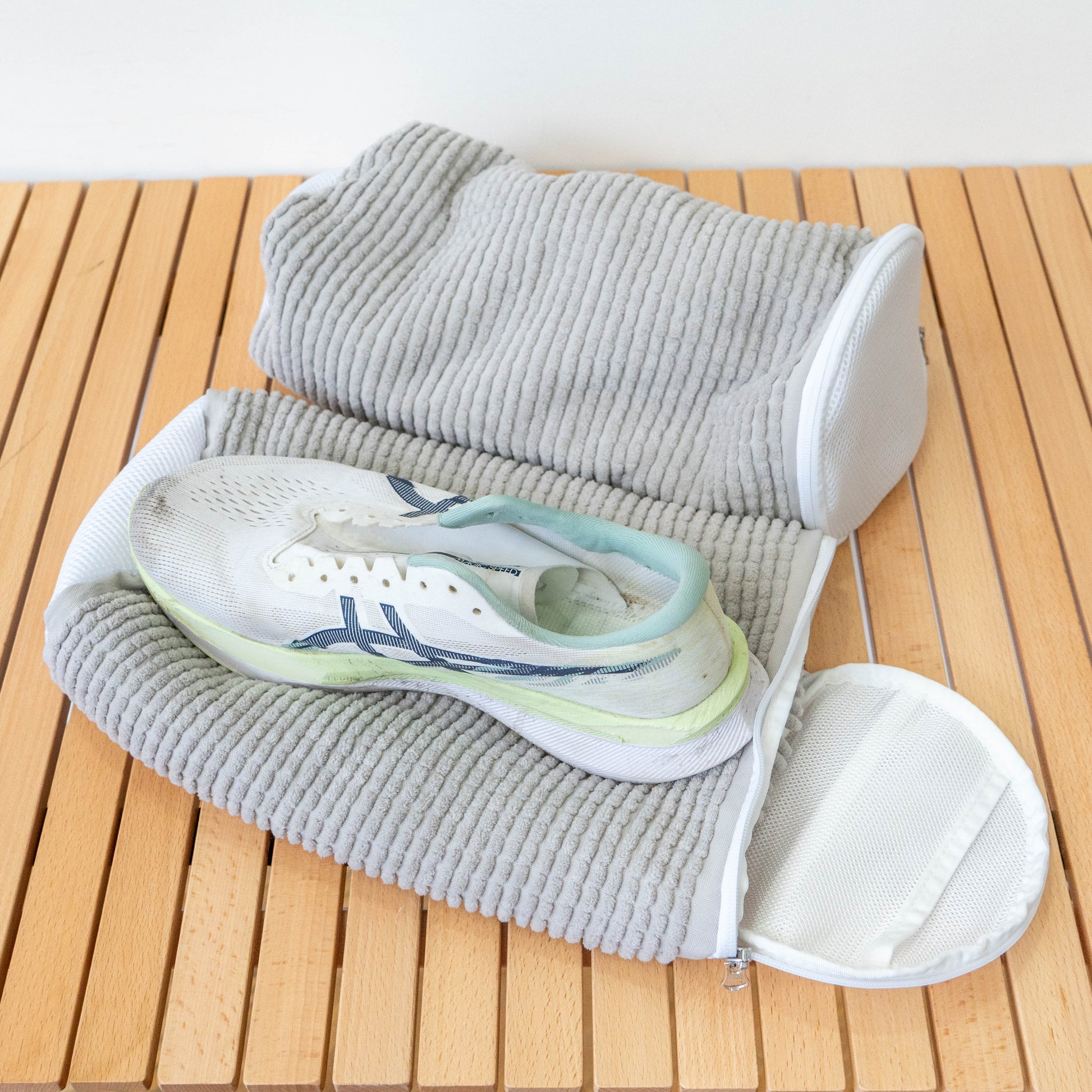 - ズックリーンネットの専用ポケットに靴紐とソールを入れ、靴本体はマイクロファイバー部分の中へ入れ、多めの水量で洗濯を行います。通常コースか、つけ置きコースで洗ってください。通常の洗濯洗剤でOK。柔軟剤は使用しません。