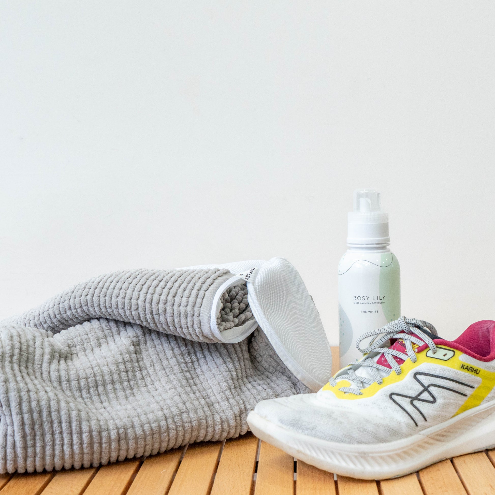 市販の洗剤でも洗うことができますが、ROSY LILYの靴専用洗剤「靴の洗濯機用洗剤 THE WHITE」は白をより白くする靴用洗剤ですので、ホワイトカラーのシューズにはこちらがおすすめです。