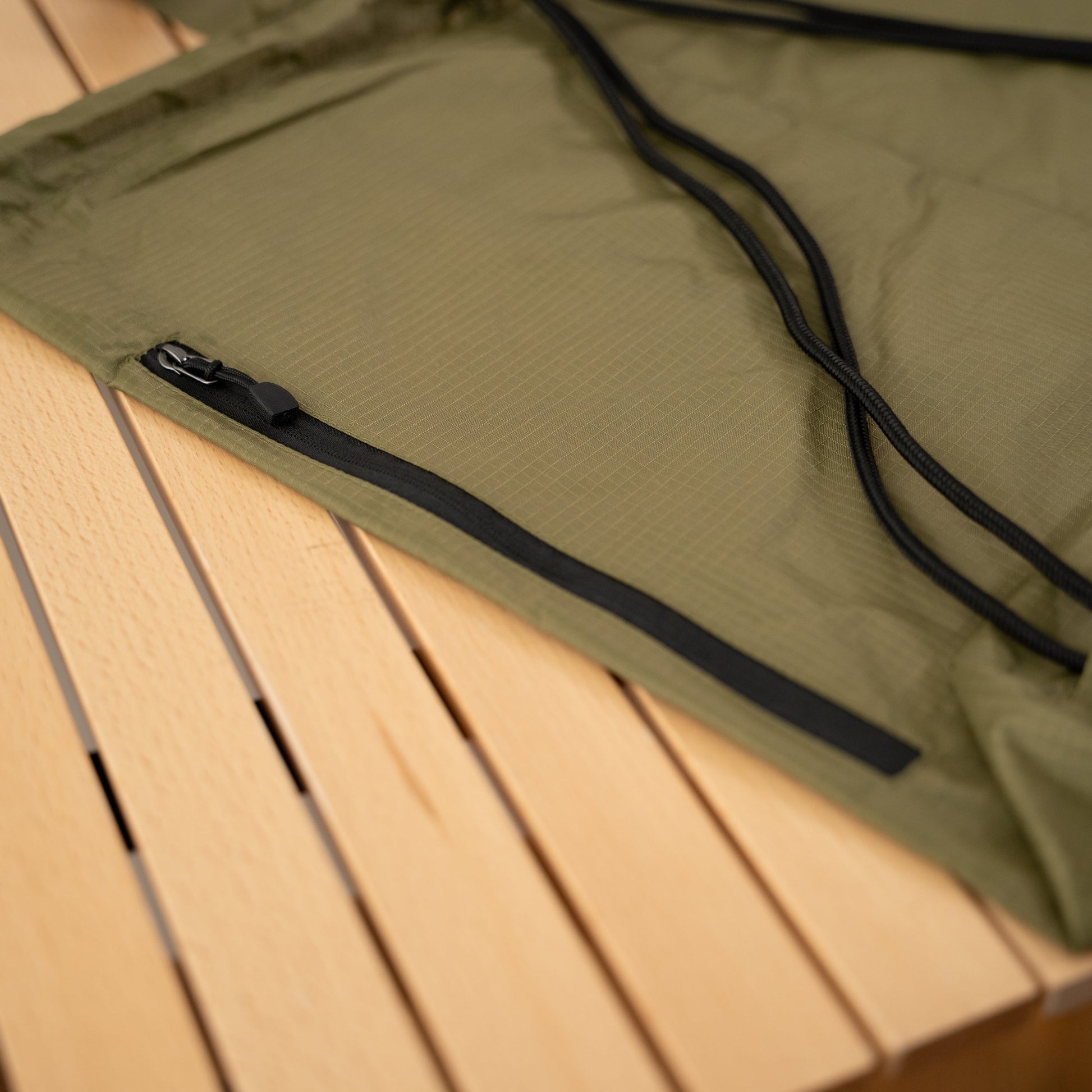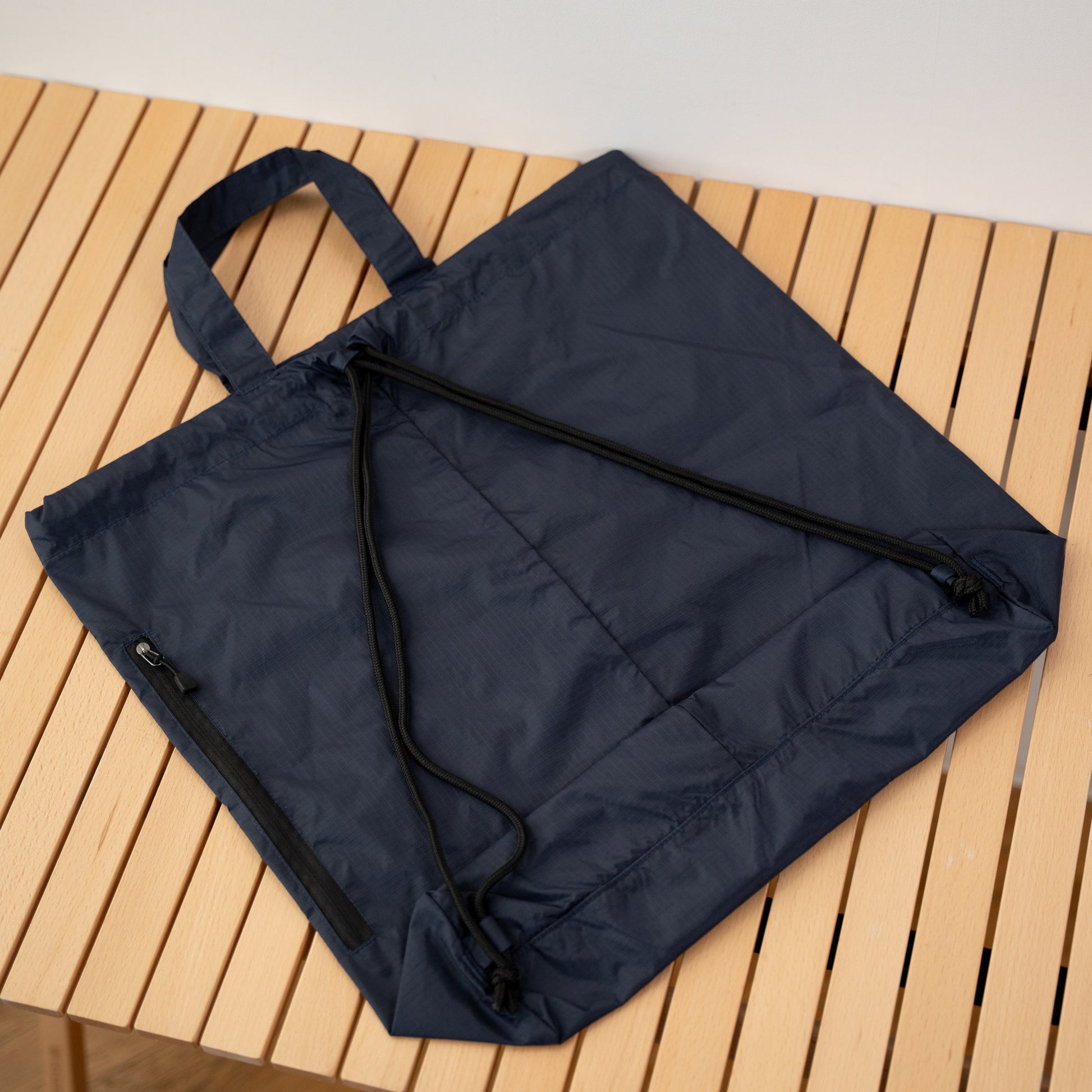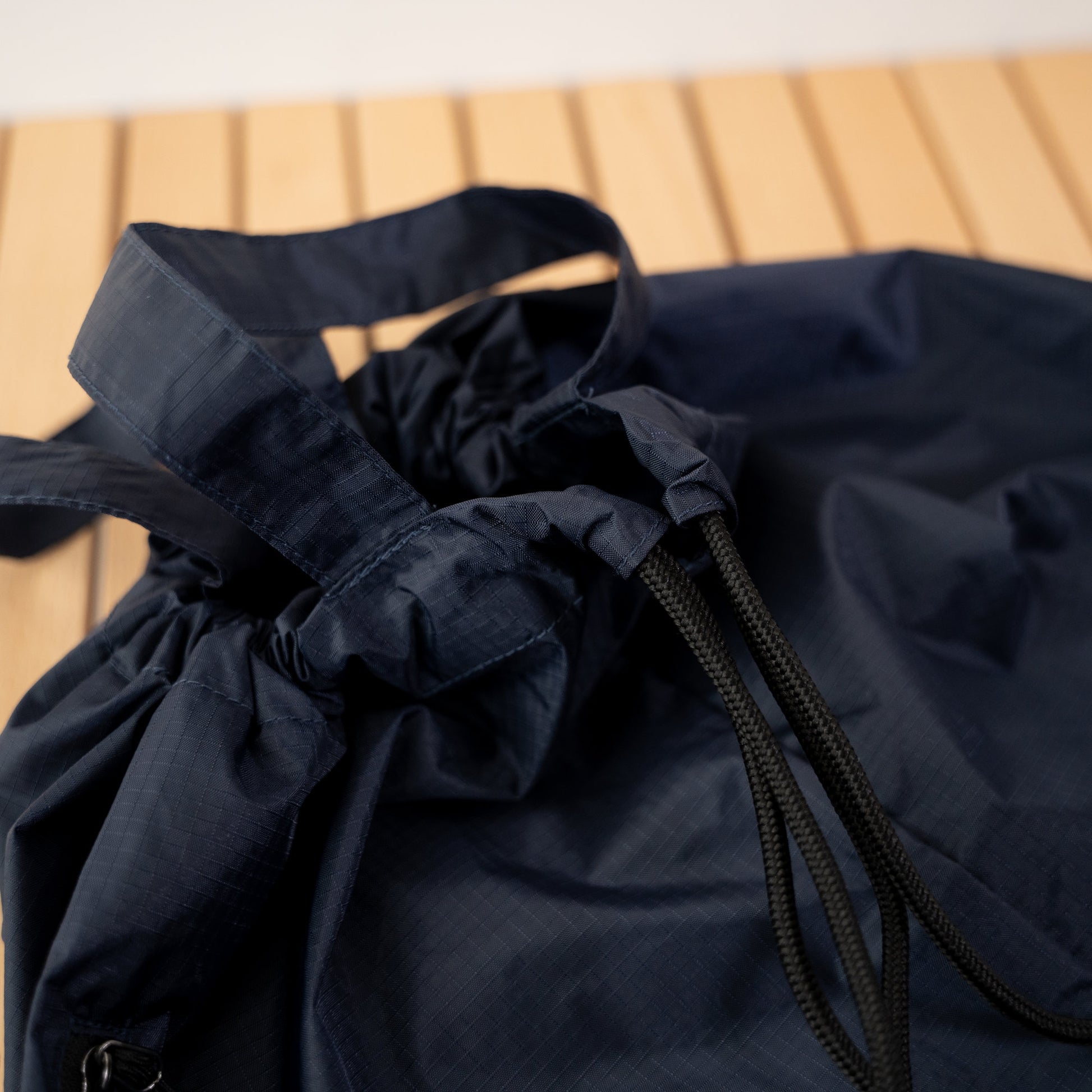 紐を絞って背負うことも、手持ちでも使えるのでメインバッグにもサブバッグにも、シューズバッグとしても使える程よいサイズ感と、薄手のナイロン素材を選び、日常使いしやすい軽さにもこだわりました。