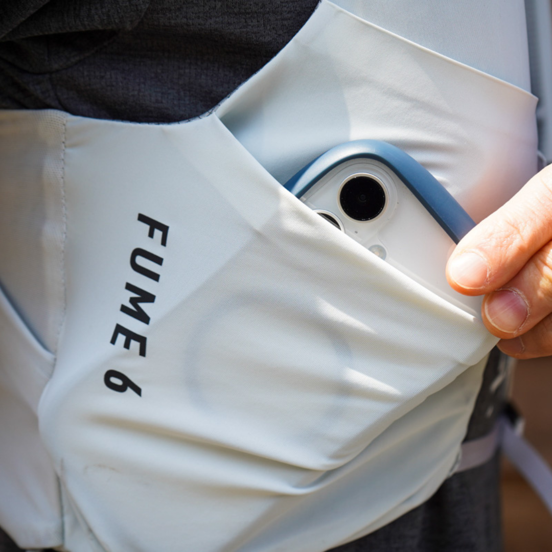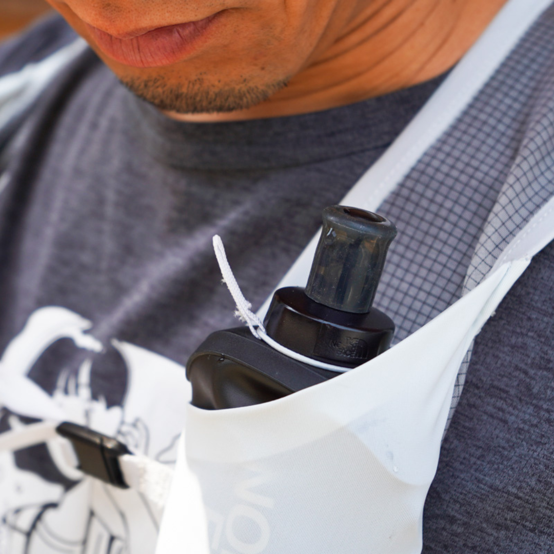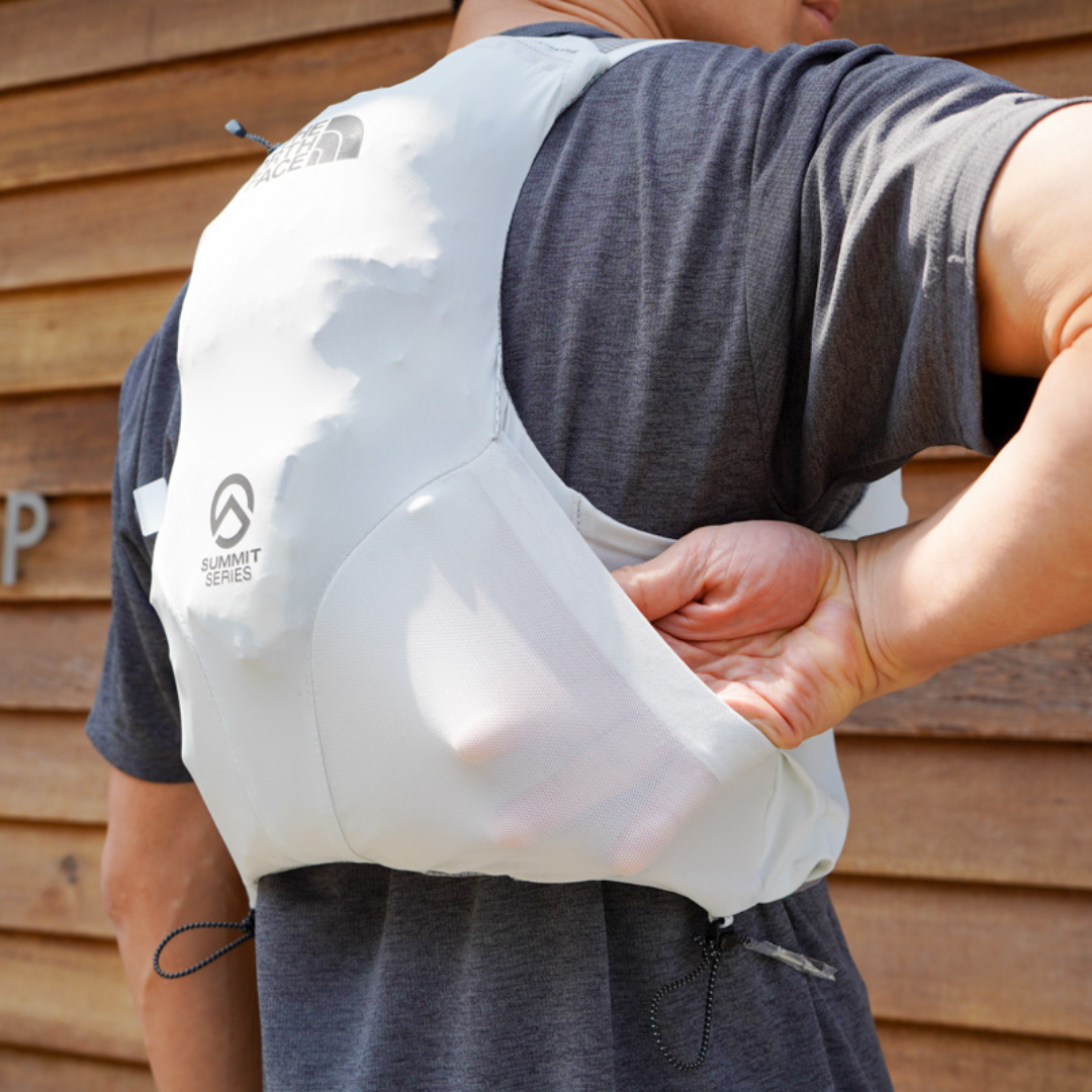 ショルダーハーネスにはボトルポケットと、補給食やグローブなどを仕分けして収納しやすい2段のポケットを装備。ヘッドライトやレインジャケットなどを収納できる背面下部の左右のストレッチポケットは、背負った状態でも後ろに手を伸ばせばアクセスしやすい設計で、パックを下ろす時間ロスを最小限に抑えて走りに集中できます。
