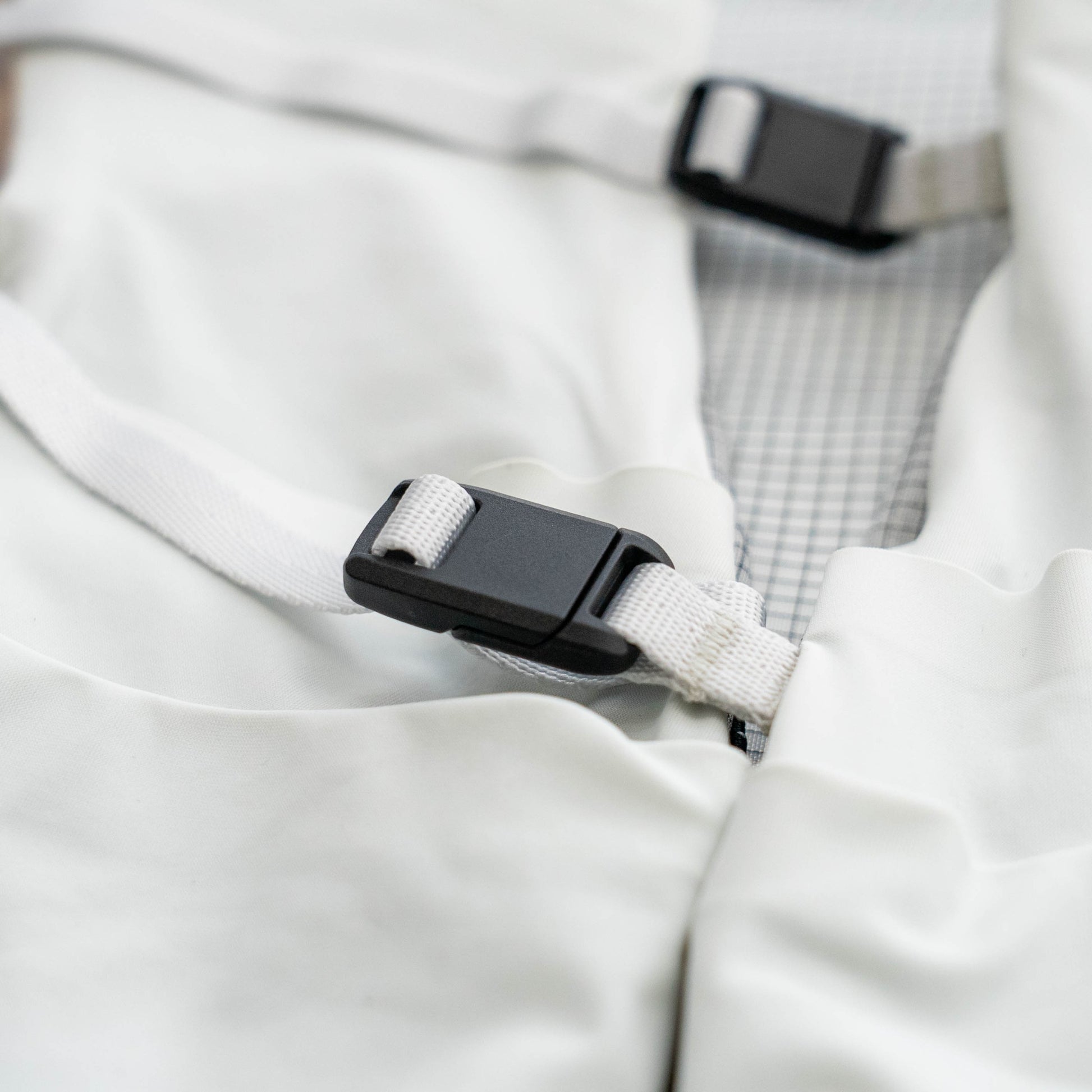 フィット感を高める3本のチェストストラップにはマグネットバックルを採用することで、すばやく背負えて着脱のストレスを軽減。