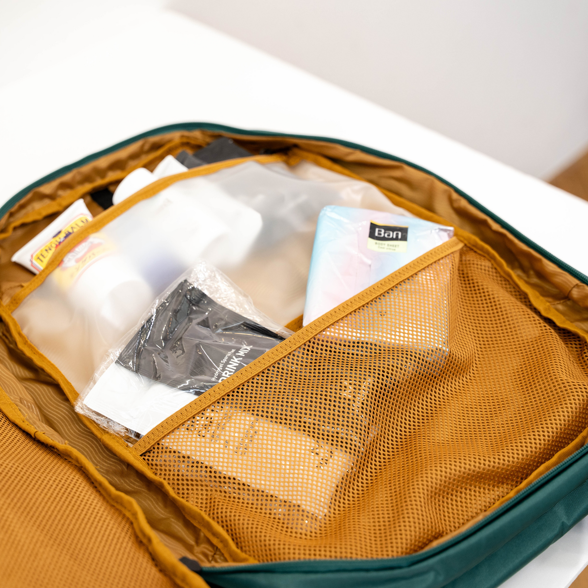 TPU素材の内部ジッパーポケットは、他の荷物を汚さない耐水性を備えています。化粧水などのスキンケアグッズや、シャンプーなどの液体アイテムなどを入れておくのに安心。不透明生地でプライバシーにも考慮されています。