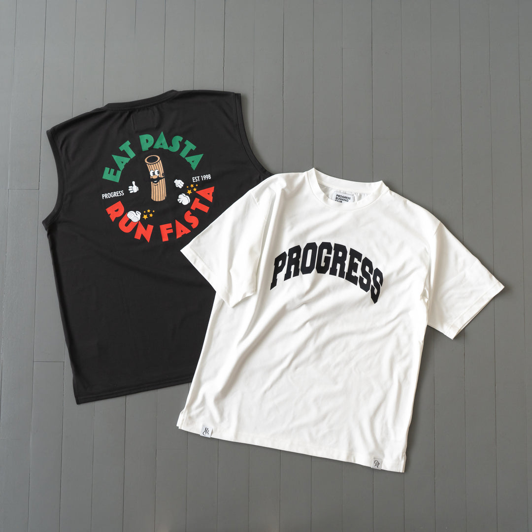 「EAT PASTA RUN FASTA」のPOPなロゴと走るパスタが目を引く、カーボローディングが楽しくなるデザインをバックにプリント。フロントには「PROGRESS」ロゴをさりげなく。
