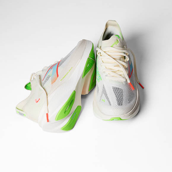 従来の「DNA FLASH v2」と比較して、11%の軽量化、14%のエネルギーリターン向上、25%の柔軟性向上を実現。この2種のフォームを重ねた二層構造ミッドソールに、推進力高める「Speed Vault プレート」を組み合わせることで、高いクッション性・安定した着地・スムーズな重心移動・力強い蹴り出しを同時に実現しました。