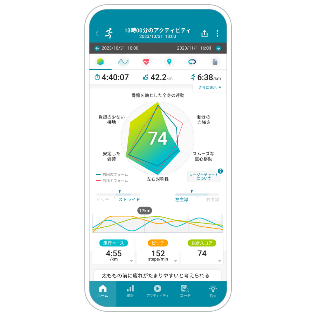 モーションセンサーで計測したデータを基に、走りの特徴や体の使い方を6つの軸で評価し、スコアで表示。ランニングフォームの確認および改善点の把握に役立ちます。
