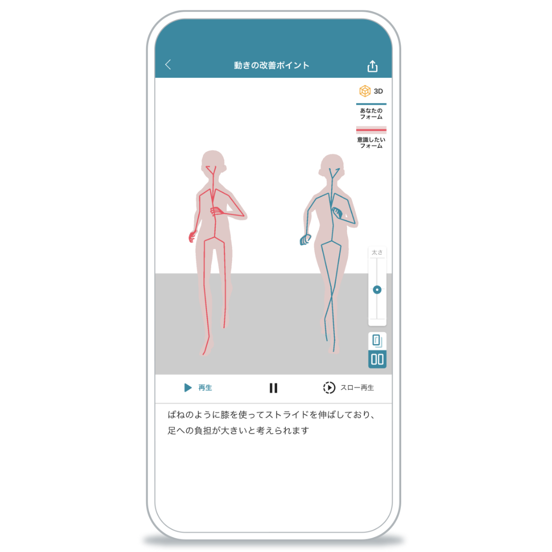 ランニングフォームをアニメーションで表示し、改善点をアドバイス。正しいフォームとの違いを知り、身体の動きに対する理解を深めることで、効率よく、負担の少ない走り方が身につきます。