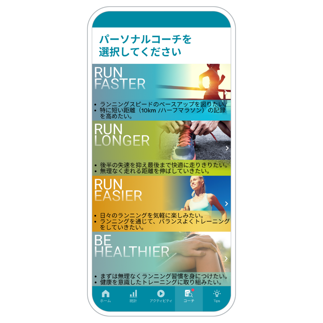 フルマラソン挑戦から運動不足の解消まで、ひとりひとりの目的、レベルにあった練習プランを自動作成。提示されたスケジュールにそってワークアウトメニューをこなすことで、効率的に目標を達成できます。走りを、動きを感知する。
