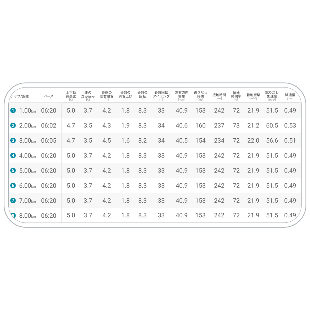 加速度3軸+ジャイロ3軸+磁気3軸の9軸センサーに加えてGPS機能を搭載。ピッチ、ストライド、接地時間、上下動、左右方向衝撃、体幹の後傾、骨盤の回転、骨盤の左右傾きなど20種類以上の計測項目をもとにランニング中の動きを高精度に解析。
