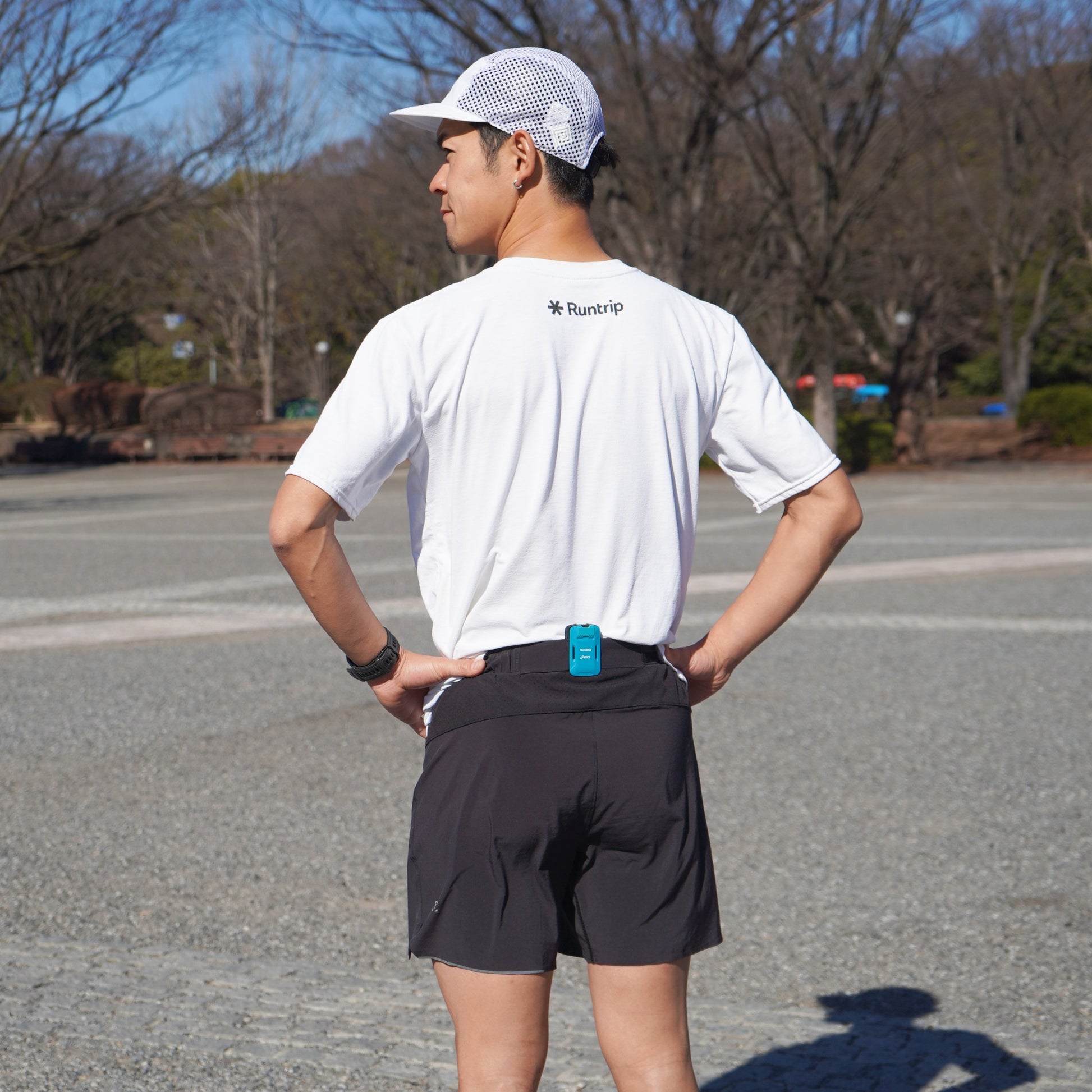 本体一体型のクリップで、ランニングパンツへの装着が簡単。ウェアの厚さに合わせて固定できる、2段階のスライドロック機構付き。