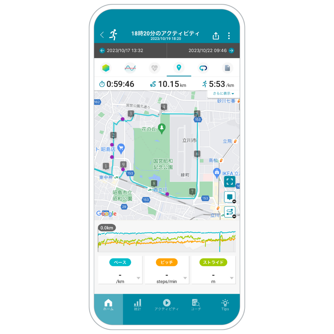 計測データをアクティビティごとに一覧表示。日ごとの走行距離・時間・ペース・フォーム指標などの情報を確認できるほか、週/月/年別の統計データも集計。トレーニングログとして管理できます。