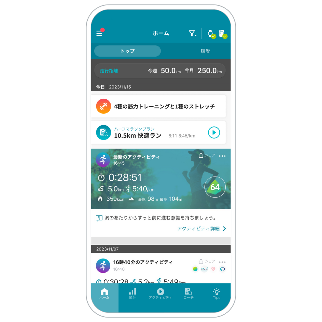 ホーム画面に、その日のトレーニングメニューを表示。前回のアクティビティデータで改善点をおさらいしながら、次にやるべきことが一目でわかり、目的意識をもって練習に取り組めます。