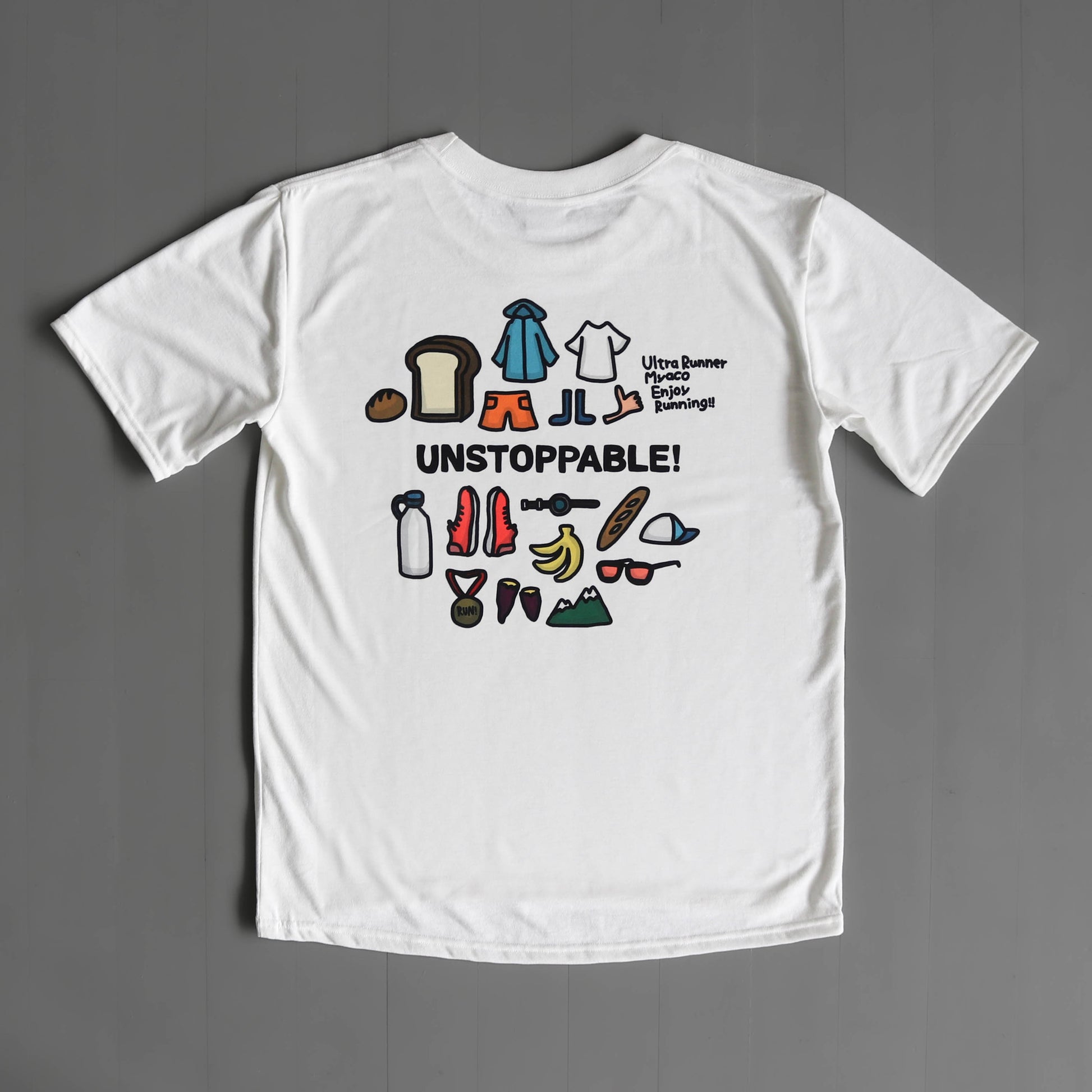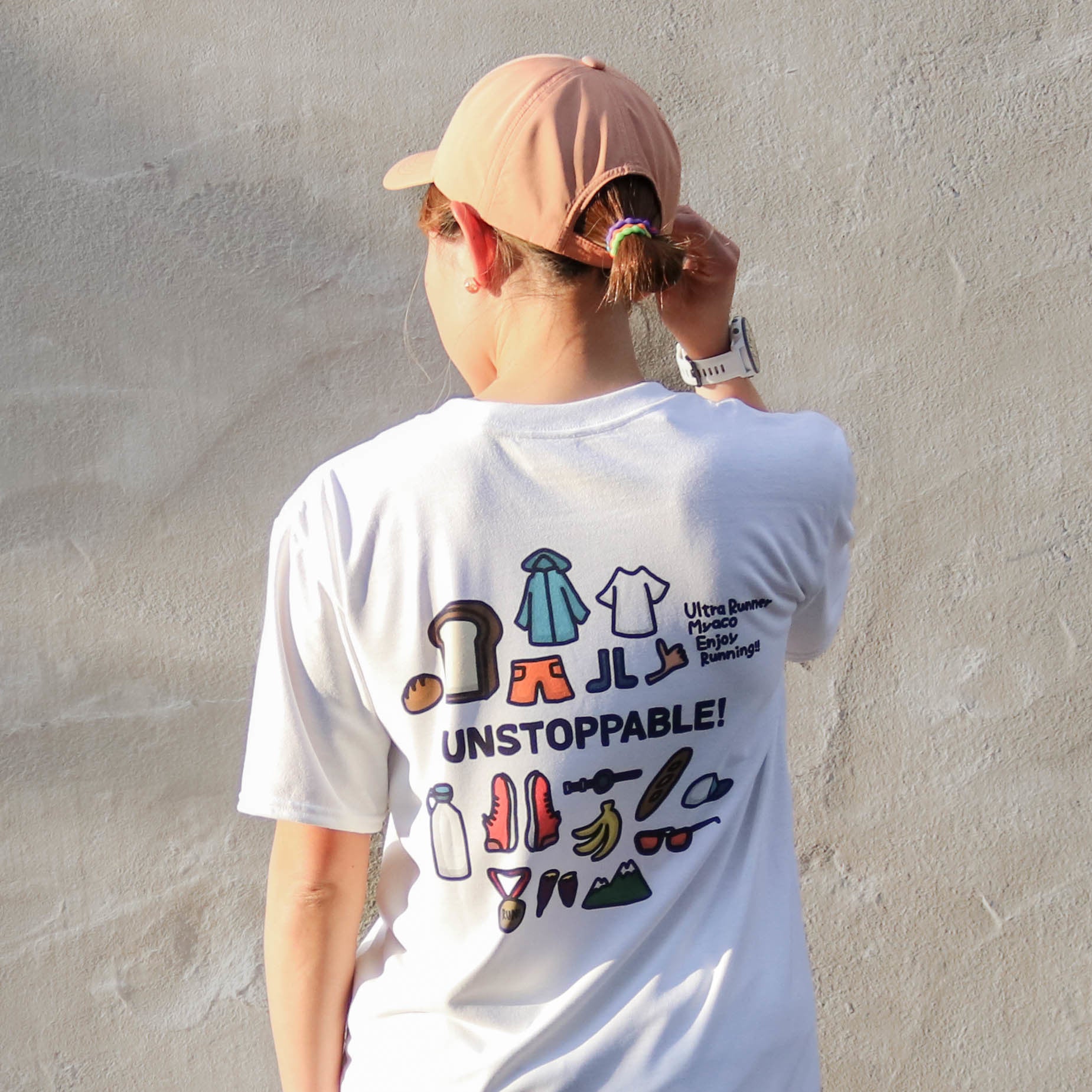バックプリントには、私がランニングに欠かせないもの、大好きなもの、ワクワクするものが描かれています。 真ん中に書かれた「UNSTOPPABLE」は「楽しくって止まりたくない!」「走り続けたい!」という意味です。