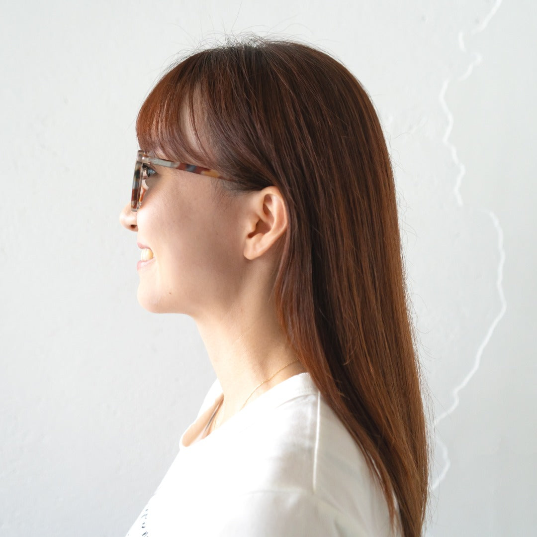 「#E」モデルは、程よい丸みのスクエアベースのフレームで、顔全体の印象を細く見せ、小顔に見せることができます。