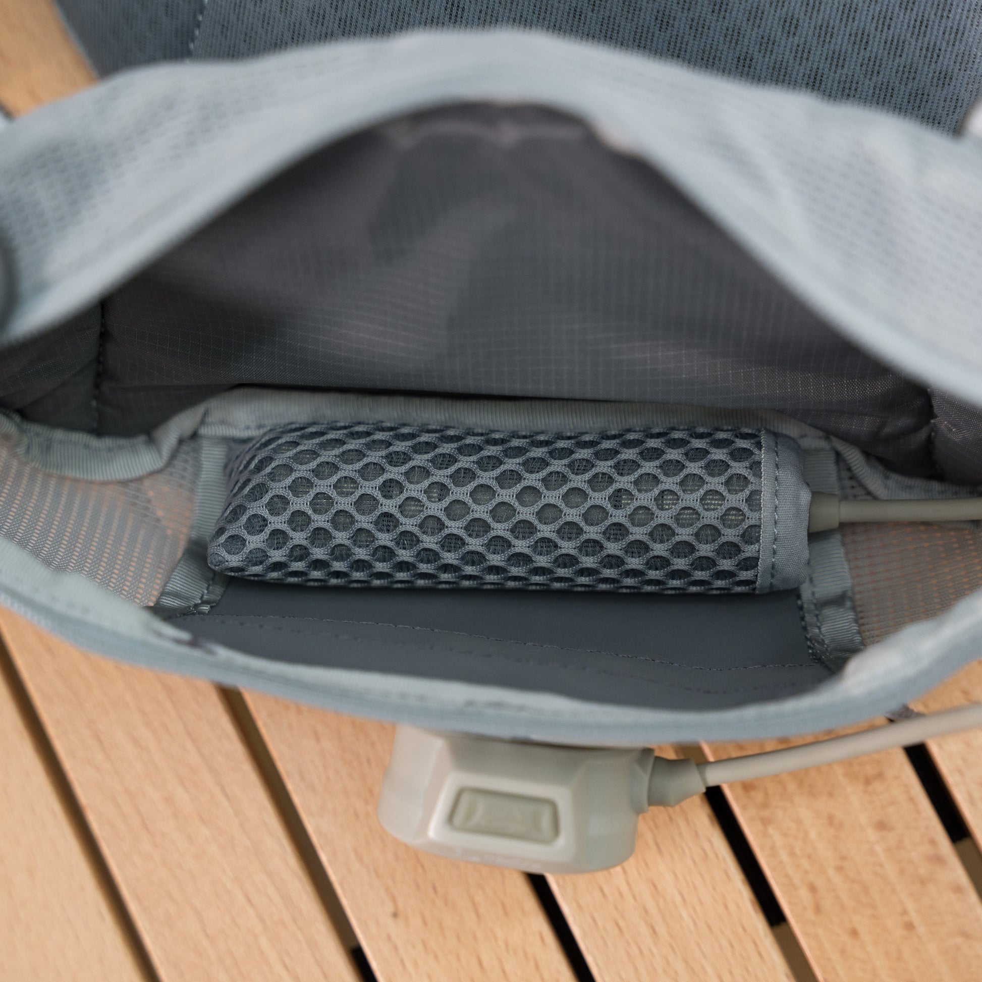 ジェルや手袋など、素早く取り出したいアイテムを前面のポケットへ。