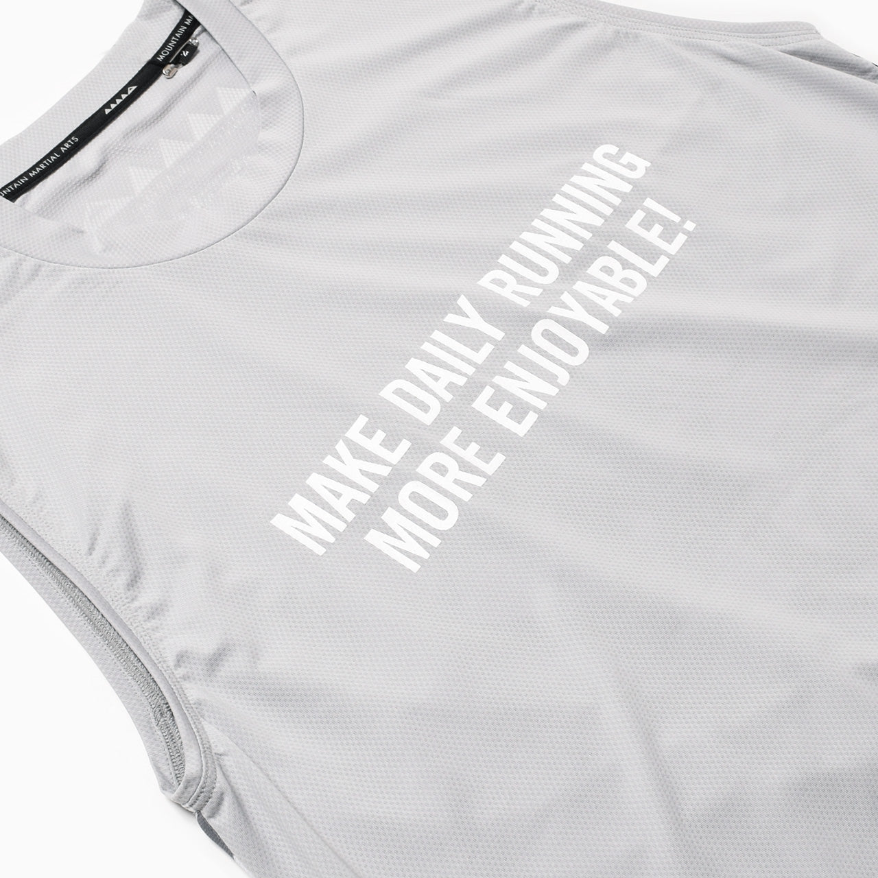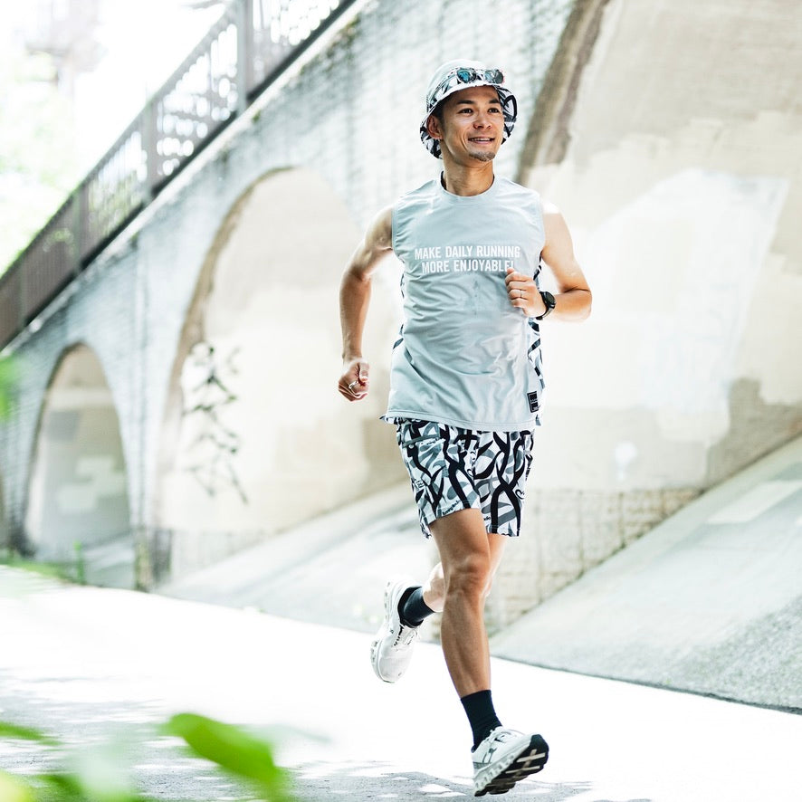 胸に「MAKE DAILY RUNNING MORE ENJOYABLE(日々のランニングをもっと楽しく!)」のメッセージ。