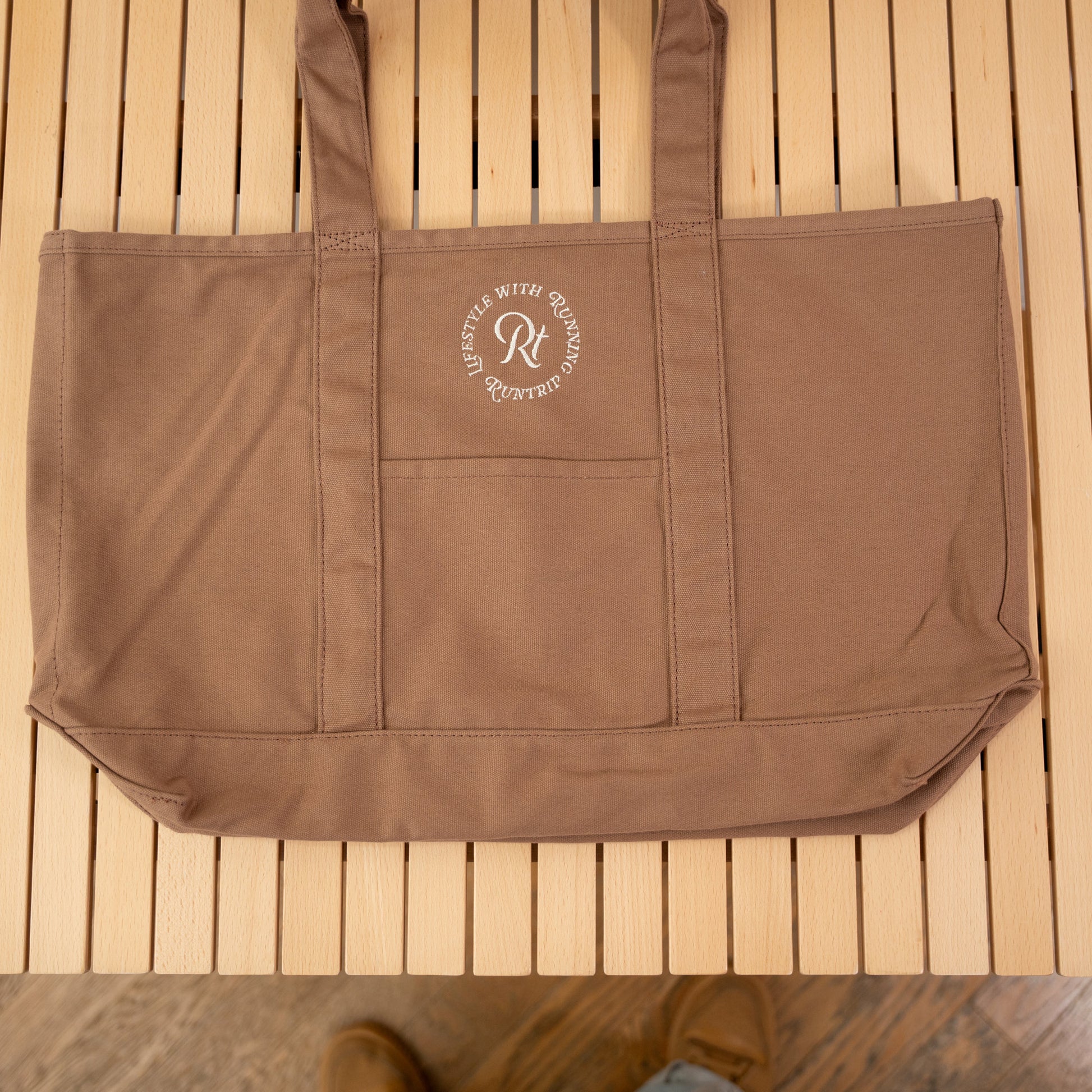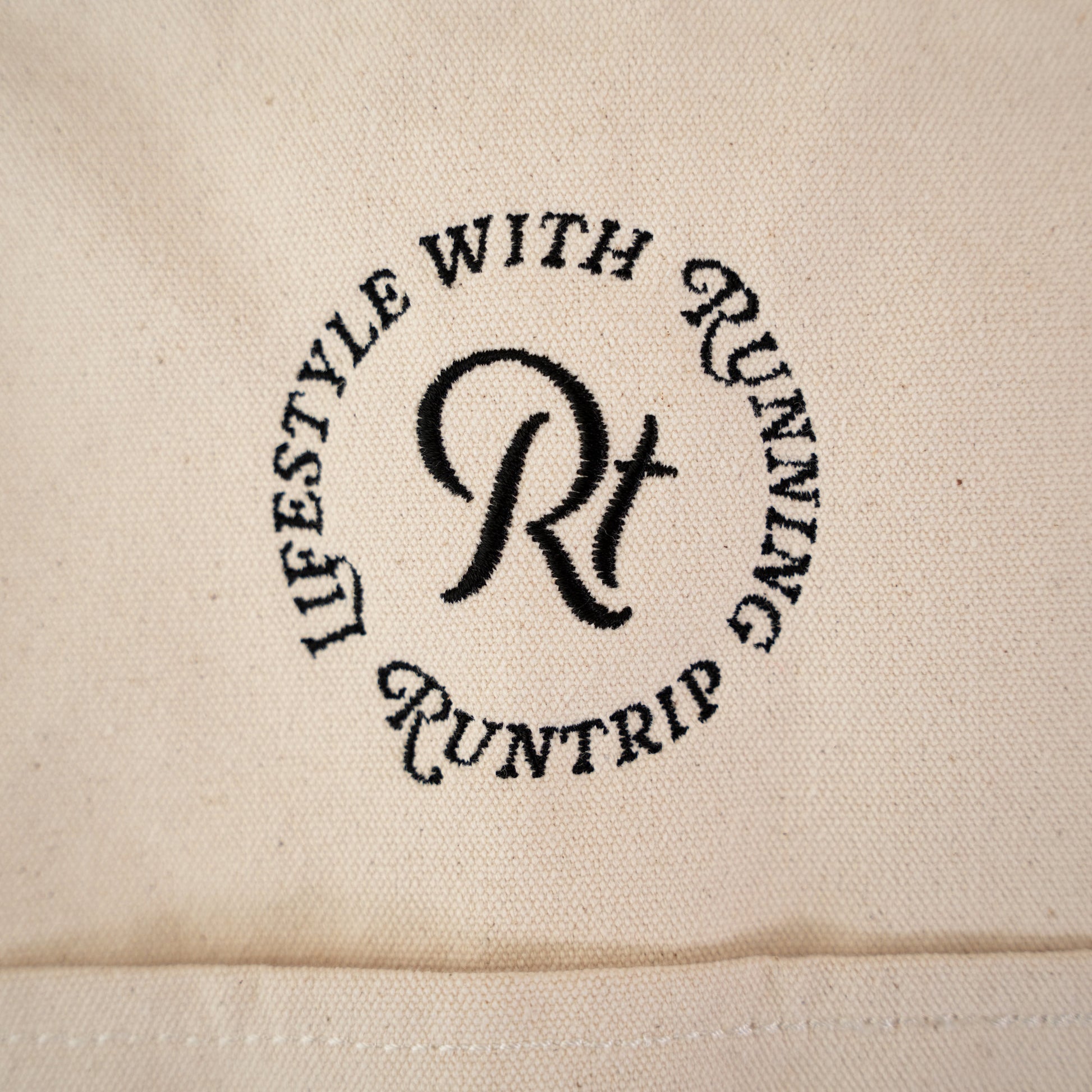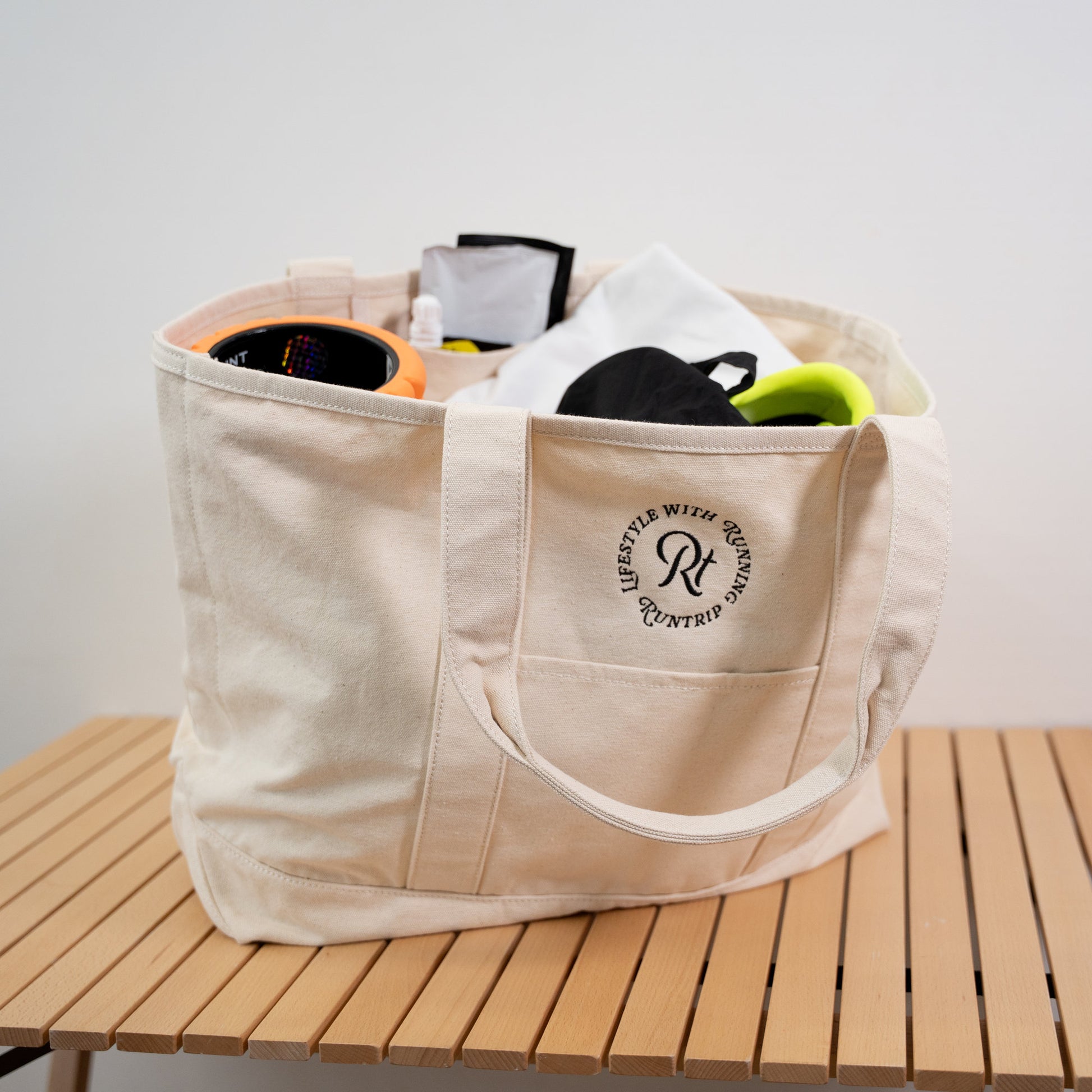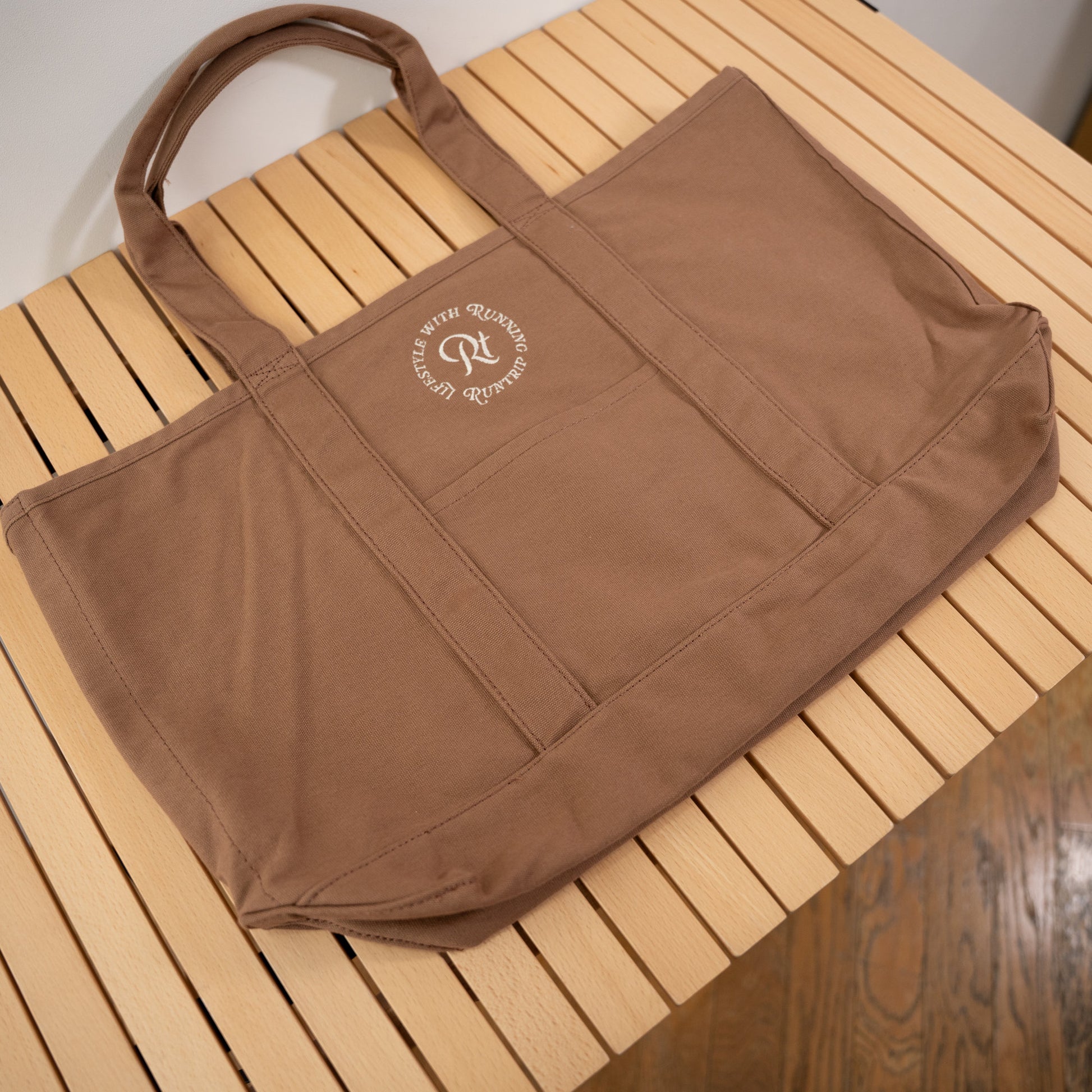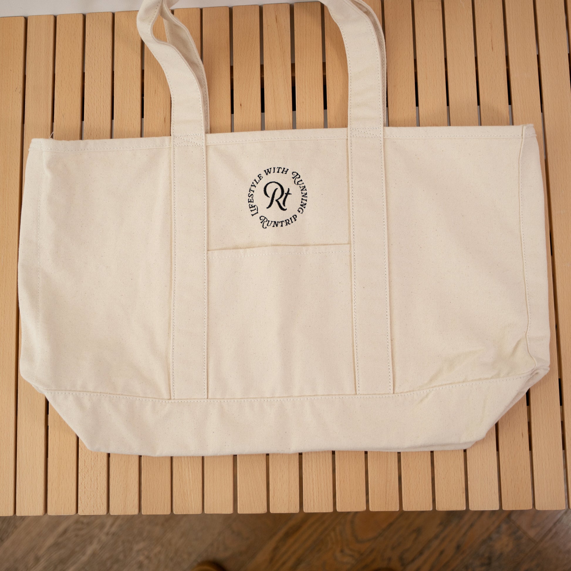 「帆布(はんぷ)」と呼ばれる厚手のコットン生地で織られた、Runtripオリジナル大容量トートバッグ。