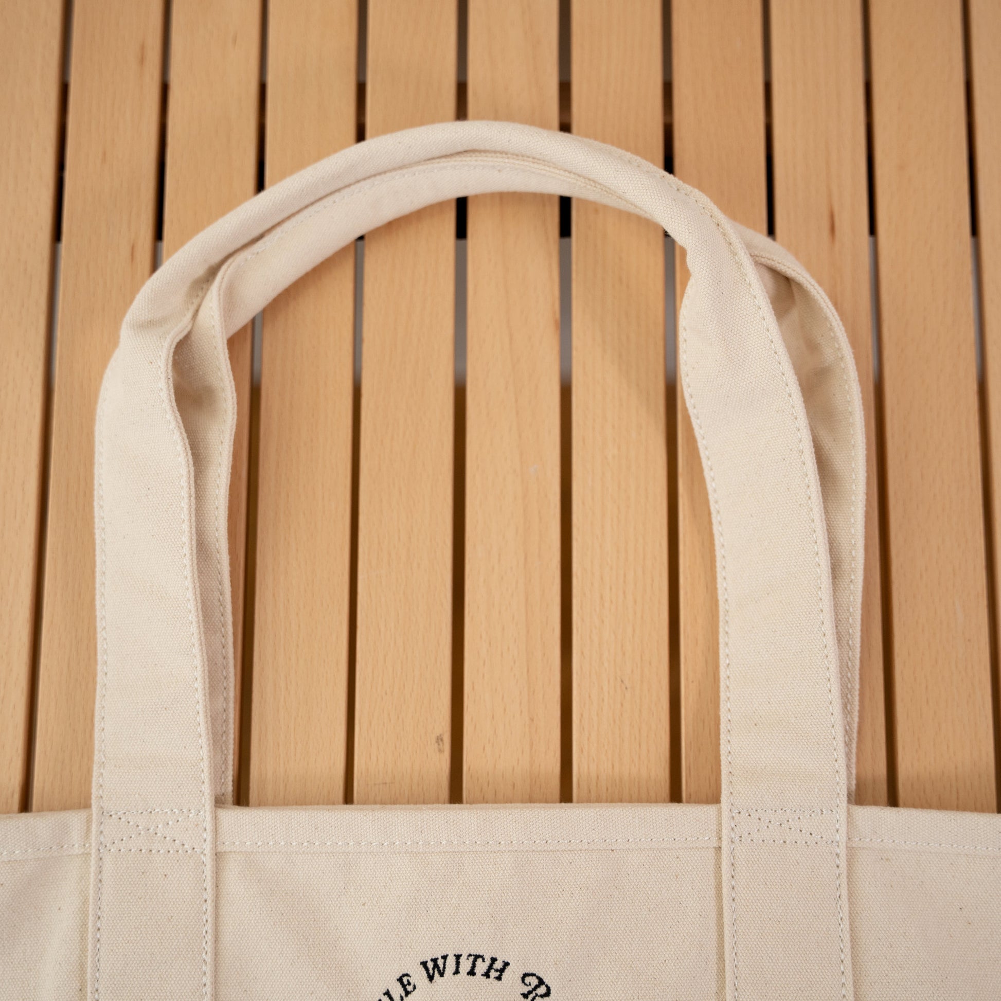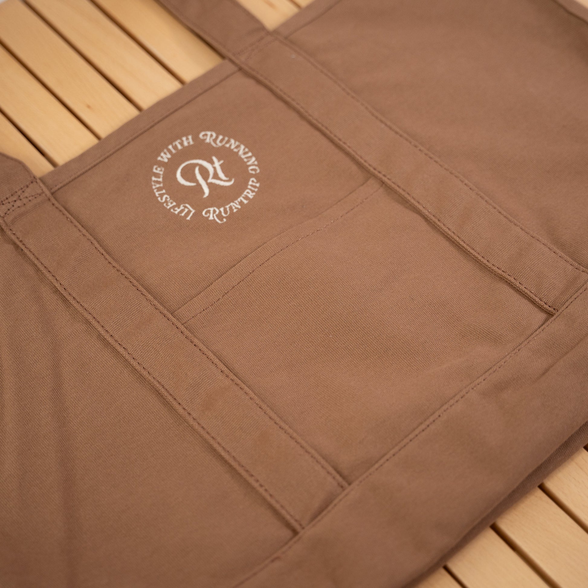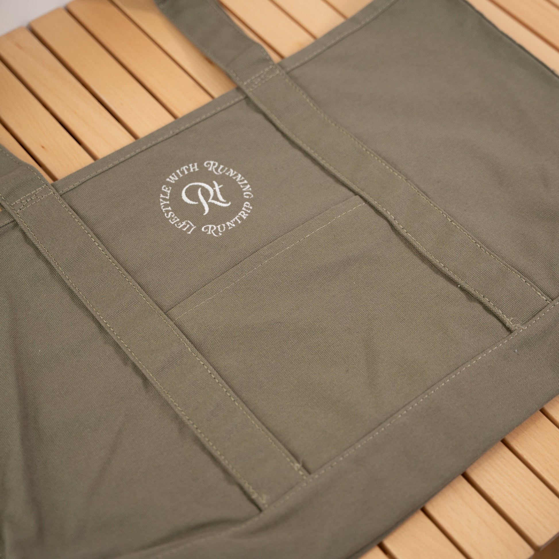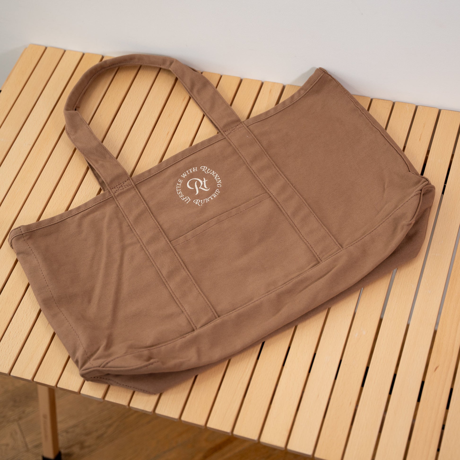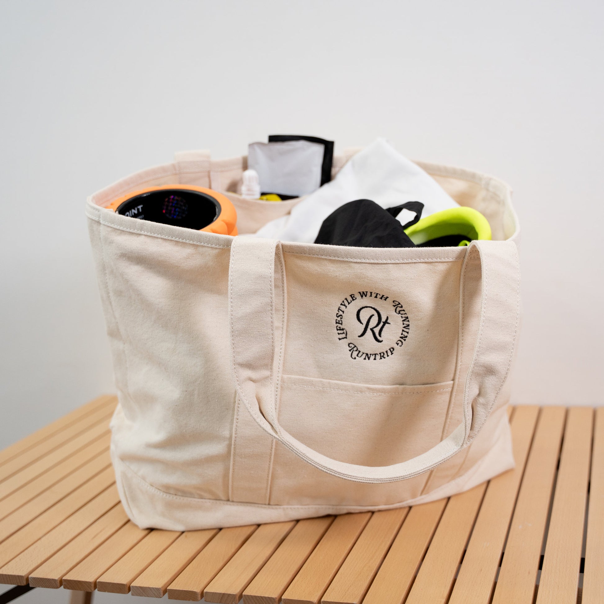 「帆布(はんぷ)」と呼ばれる厚手のコットン生地で織られた、Runtripオリジナル大容量トートバッグ。