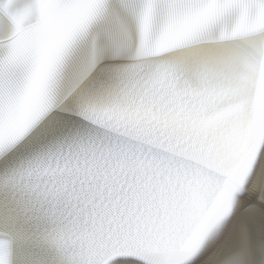 そんな「生き方」「走り方」を体現するために選んだのが古着のリサイクルによって生まれたポリエステル。これを綿の裁縫で紡ぐことによって生まれたのがコットンライクでサステイナブルなホワイトボディ。さらにポリエステルの機能性により表面の毛羽立ちが抑えられ、毛玉を防ぎ、糸抜けが防止されて長く着続けることができます。毛羽の抜けが少ないことで、海洋汚染の原因となるマイクロプラスチック流出も軽減しています。