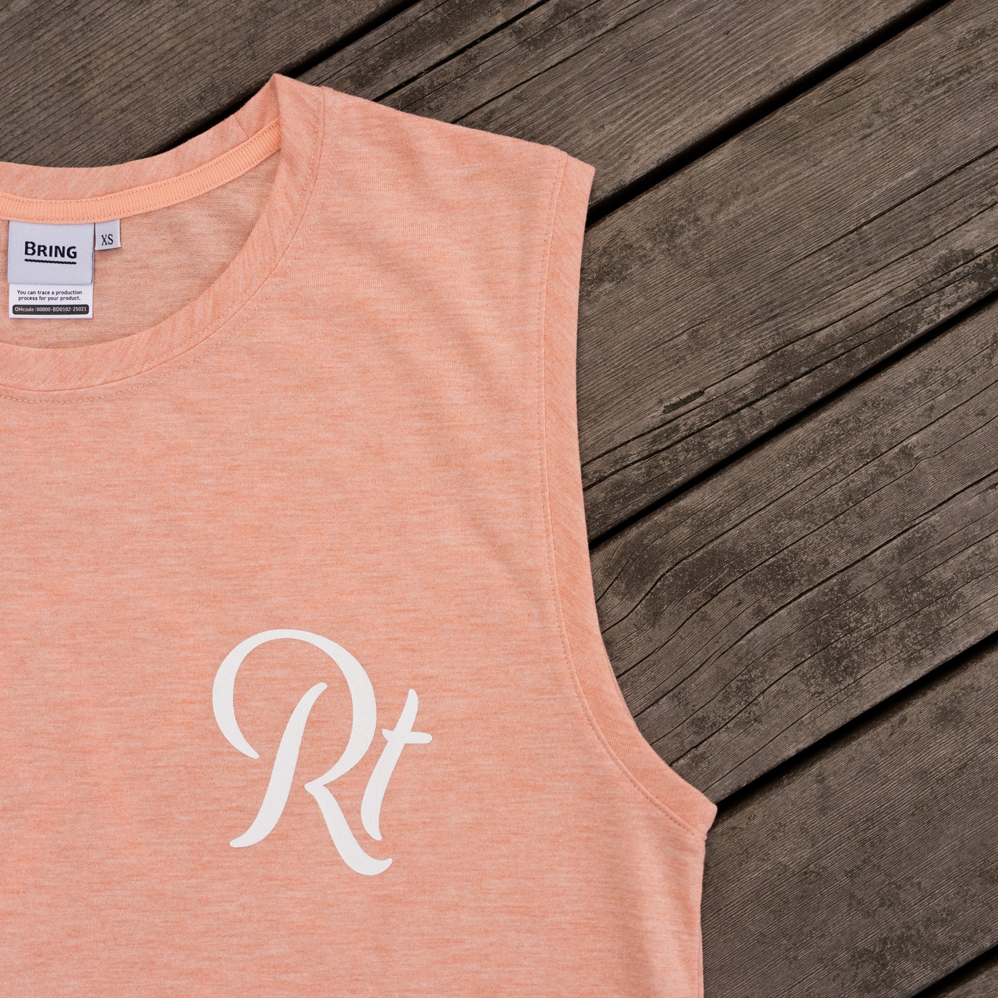 「ランニングのあるライフスタイル」をより楽しんでいただけるよう、Rt Logoを「LIFESTYLE WITH RUNNING RUNTRIP」で囲んだサークルロゴに仕上げ、後ろ見頃に大きめにデザイン、前身ごろはさりげなく胸元にRt Logoをプリントしました。