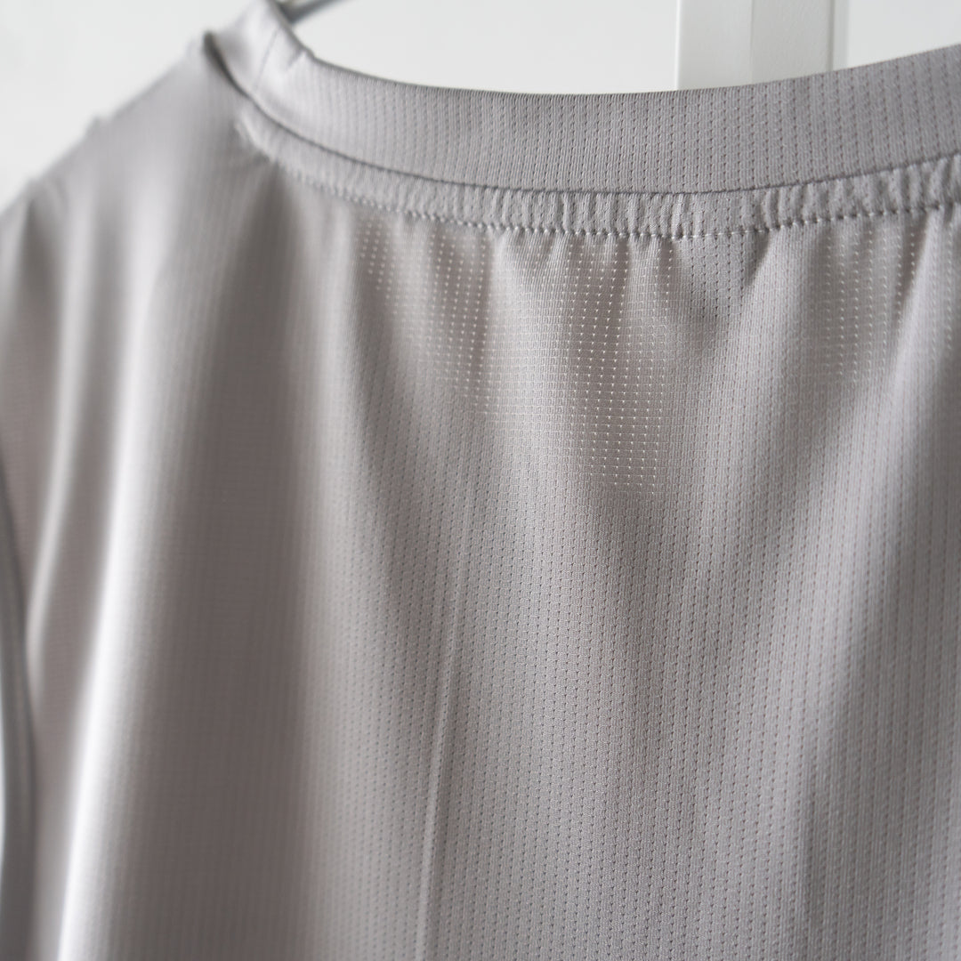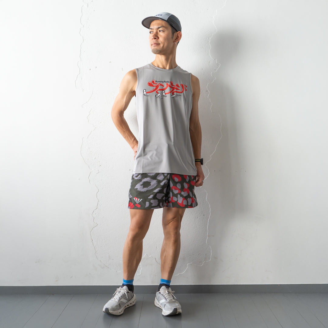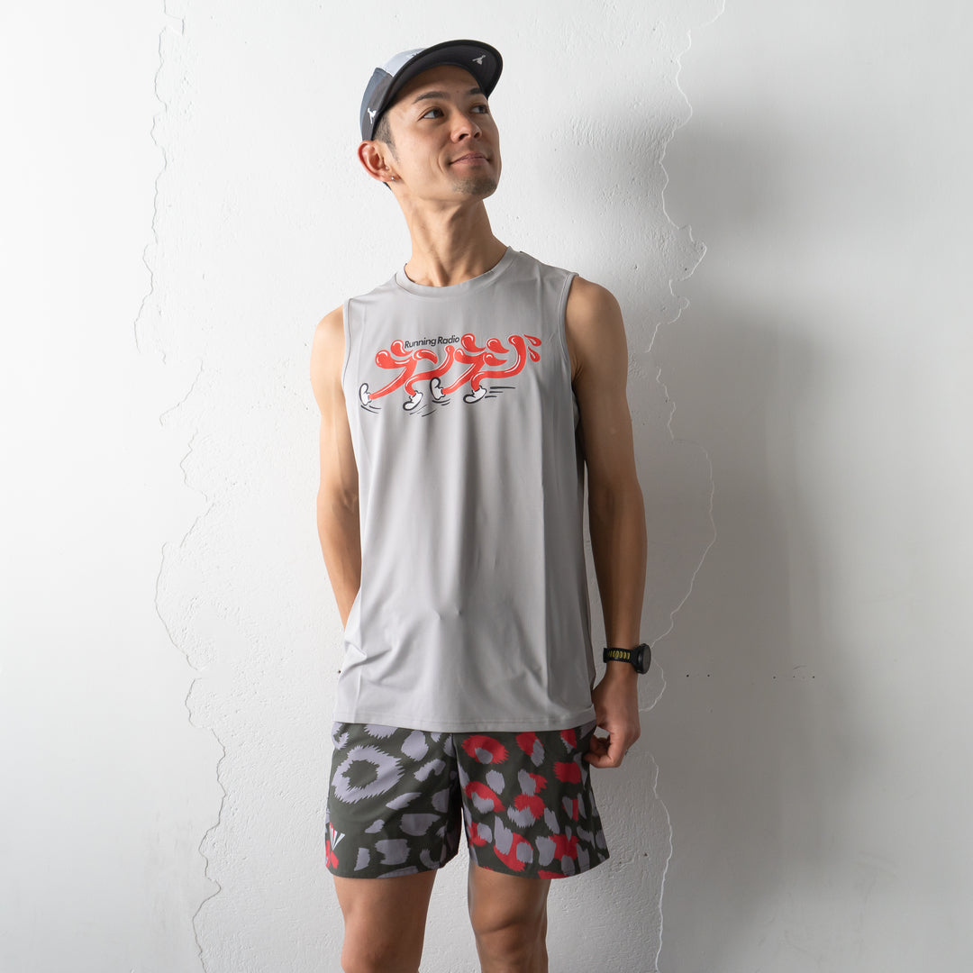 Tankは、汗をかいても透け感が出ないグレーの生地に少し明るめの「ランラジ」ロゴ。