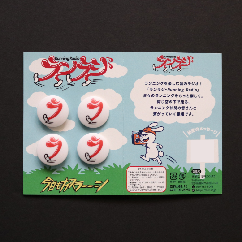 ピンを使わず、ウェアにも優しく、肌にも優しいゼッケンホルダーにランラジの「ラ」を切り取って落とし込みました。