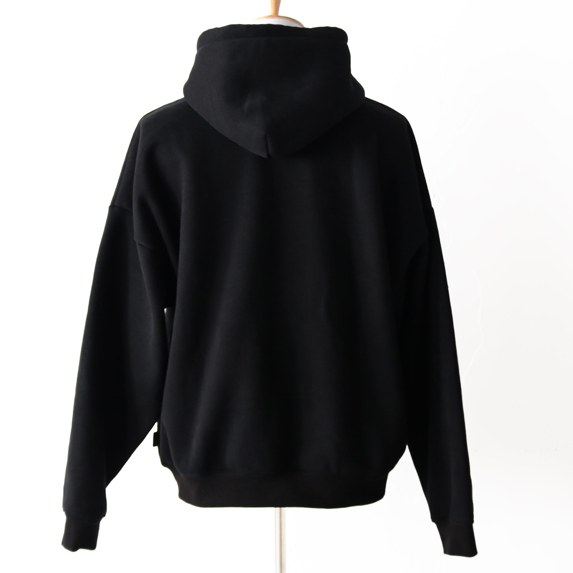 やや肉厚の裏起毛生地がふっくら柔らかいソフトな肌ざわりで、身体を優しく包み込む快適な着心地。表面はなめらかな質感に仕上がっていて、フード付きながらカジュアルになりすぎない上品な印象のボディ。