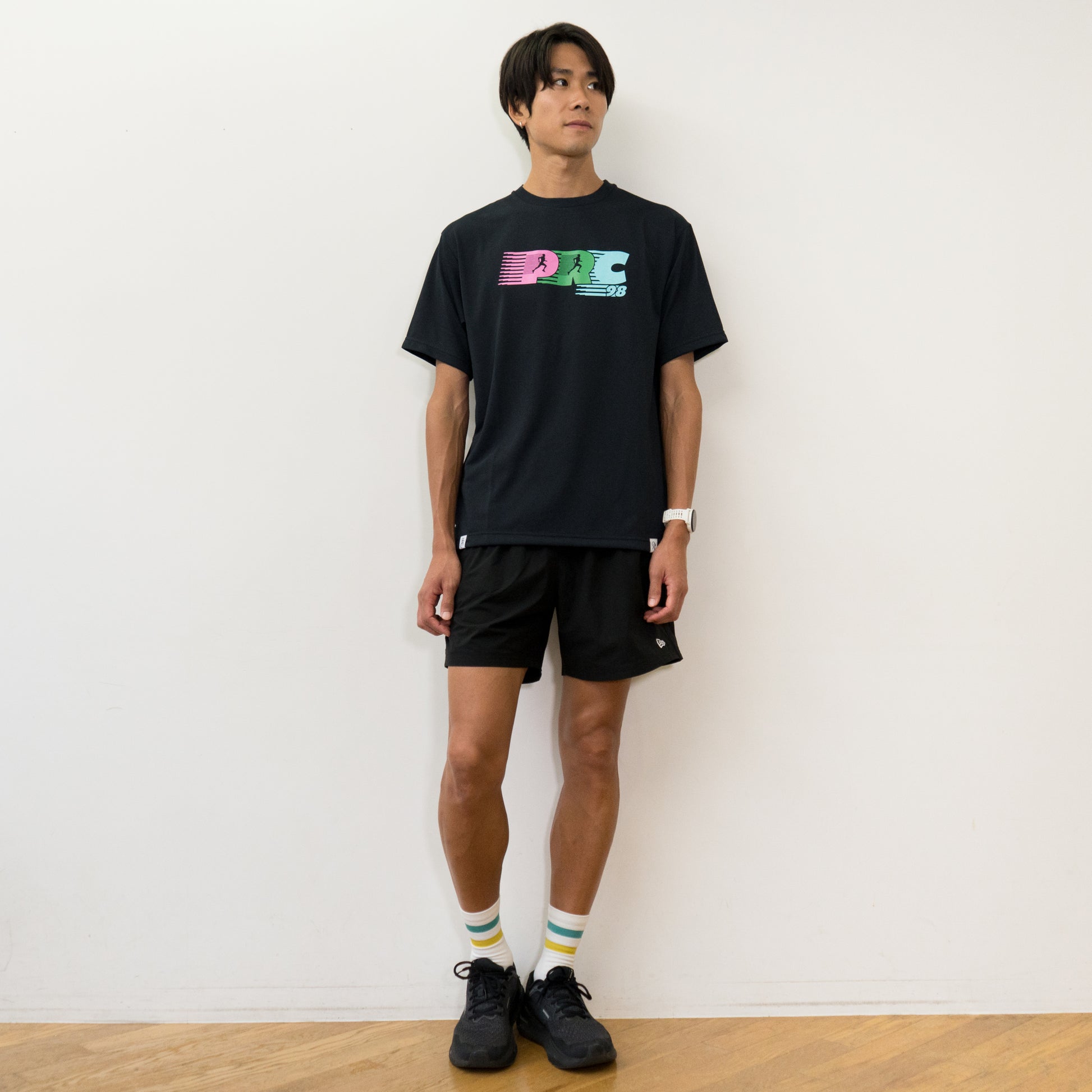 フロントには、PROGRESS RUNNING CLUBの頭文字「PRC98」のグラフィックを、ネオンカラーで大胆に配置したレトロなデザイン。
