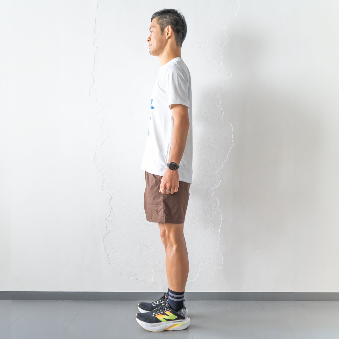 さらにTシャツの裾は背面が前面よりも長い仕様になっています。これにより、絶妙な着衣でのシルエットを実現。特にランニング時、背面の腰あたりにドリンクや携行品など収納するランナーが多いですが、その盛り上がりを長めの裾が見事に隠してくれます。逆に、前面に収納した場合は背面よりもわずかに短い裾が取り出しをより楽にしてくれます。