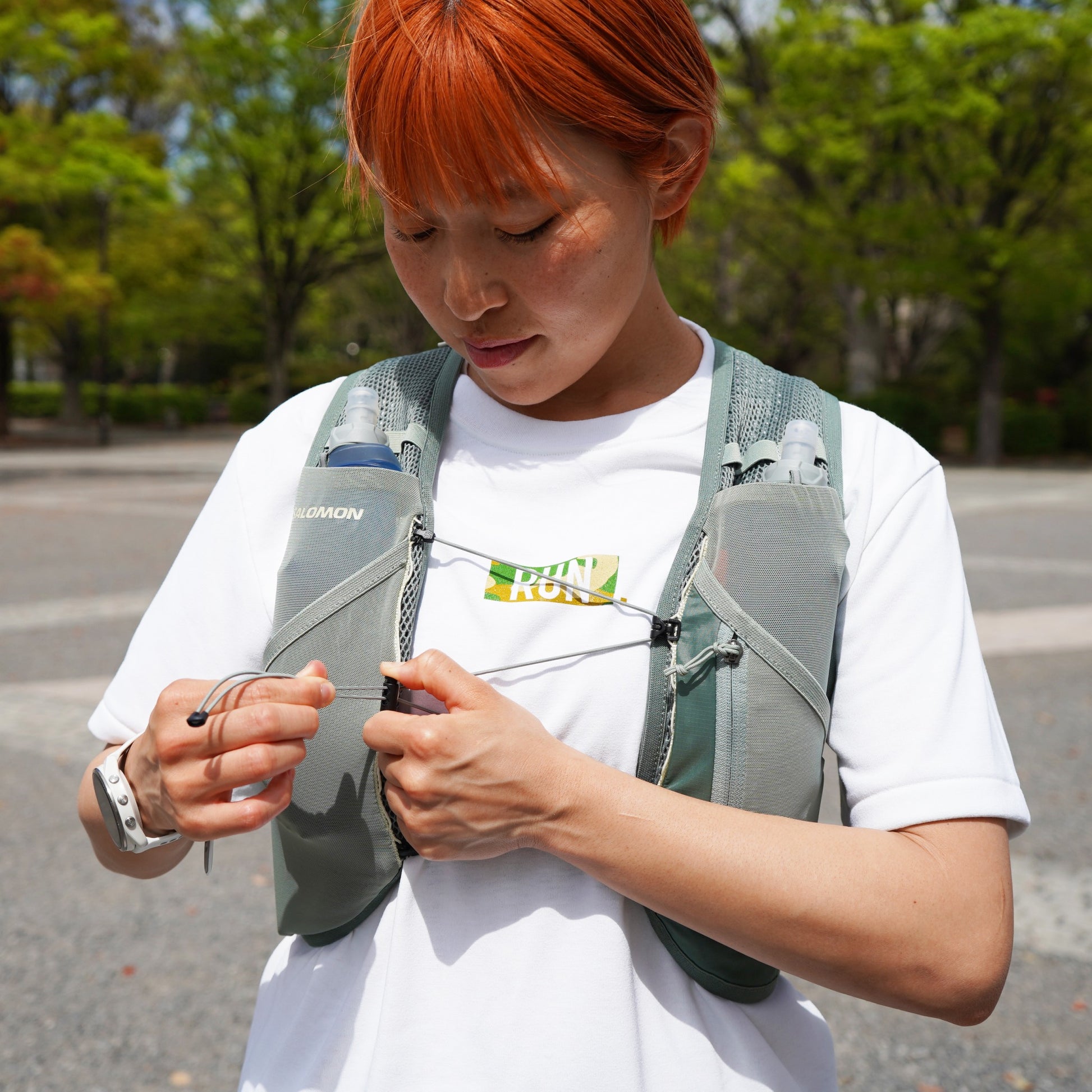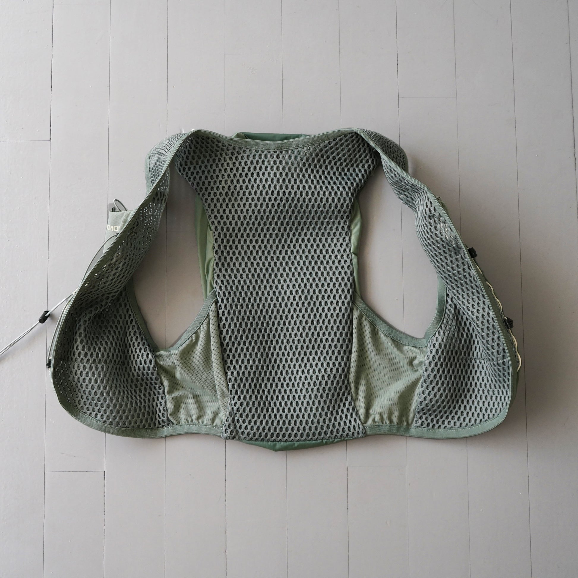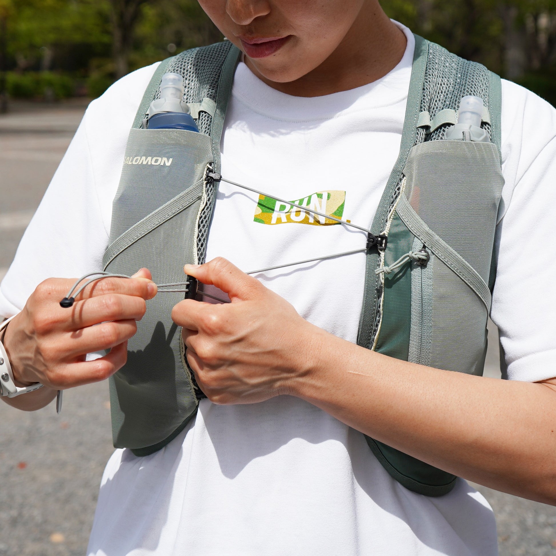 1箇所のコードストッパーでサイズ調整が可能なので、走りながらの微調整も簡単。コード自体も伸縮性があり、過度な圧迫感もなく、ベストが体にぴったり沿って安定感抜群の着心地です。