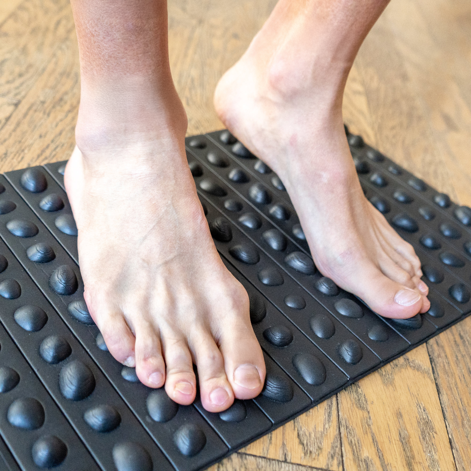 Rock Matの最大の特徴は、岩場のような不規則な凹凸です。硬めのフォーム素材を採用しているため、体重をかけると足裏のさまざまなポイントにしっかりと刺激が伝わります。この刺激が、眠っていた足裏の感覚を呼び起こし、地面を捉える感覚を研ぎ澄ませます。