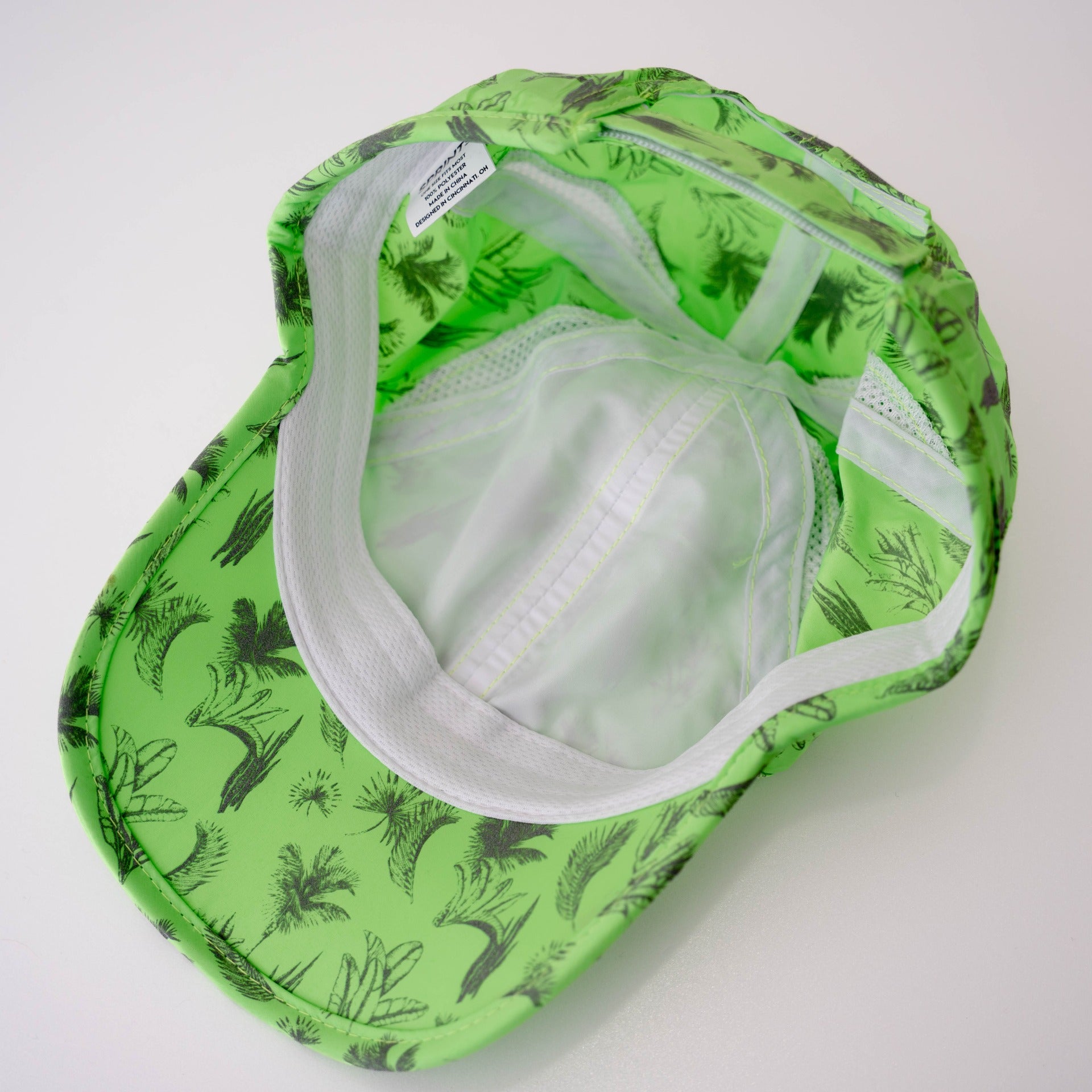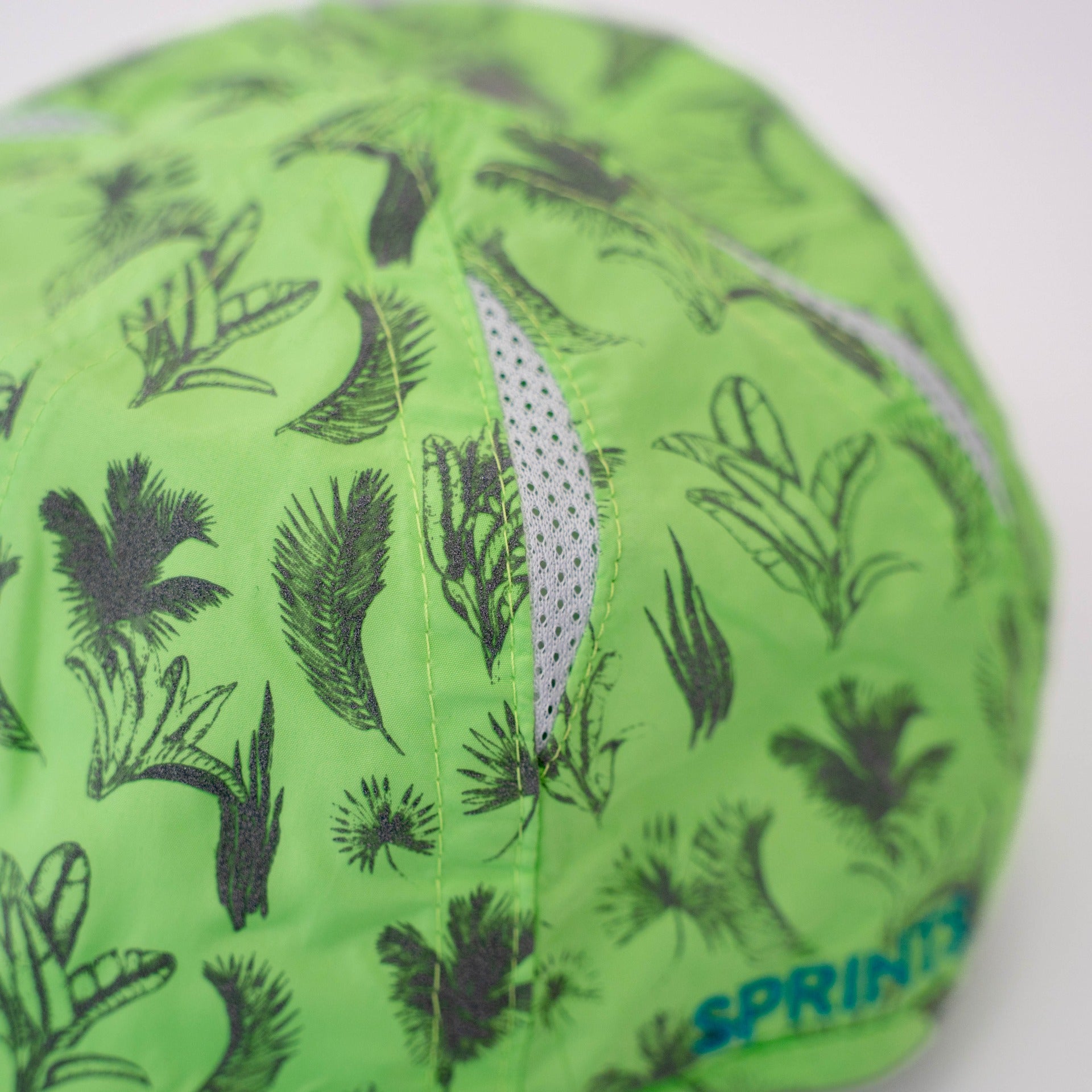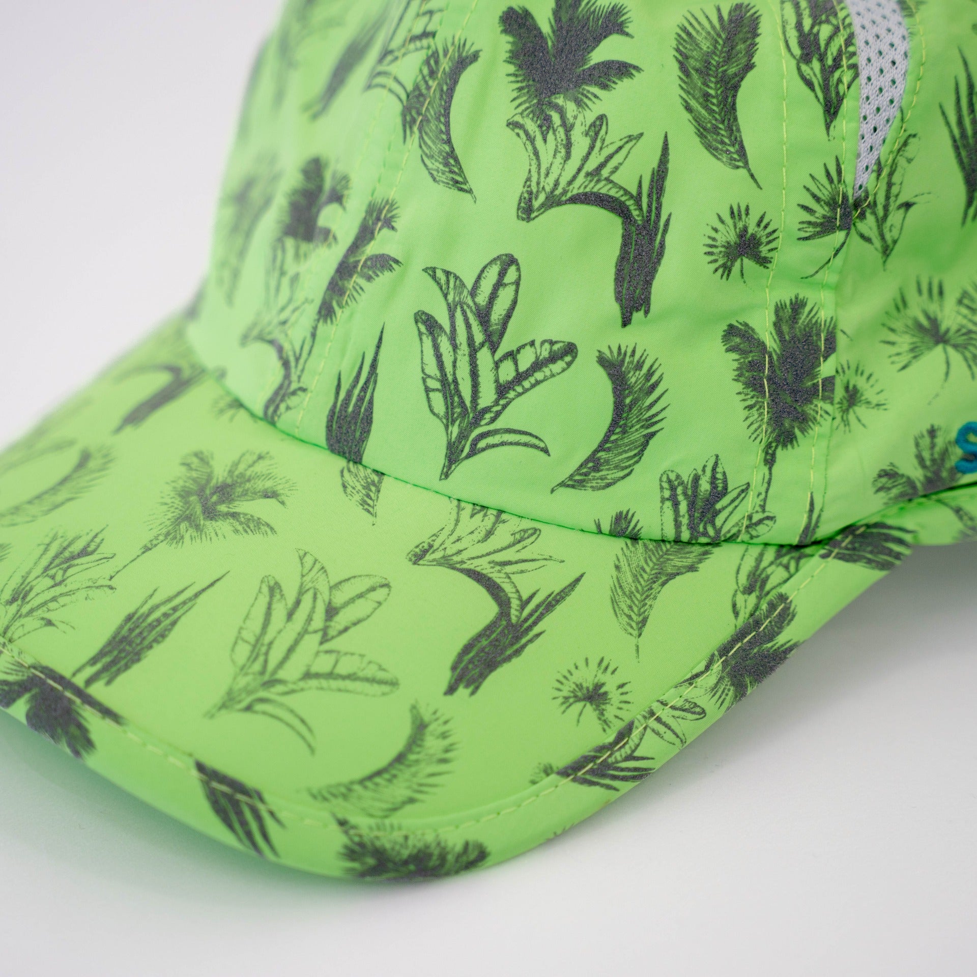 ジャングルの色々な葉がデザインされた、ライトグリーンが爽やかなキャップ。葉のデザインが光が当たると反射するリフレクタープリント。