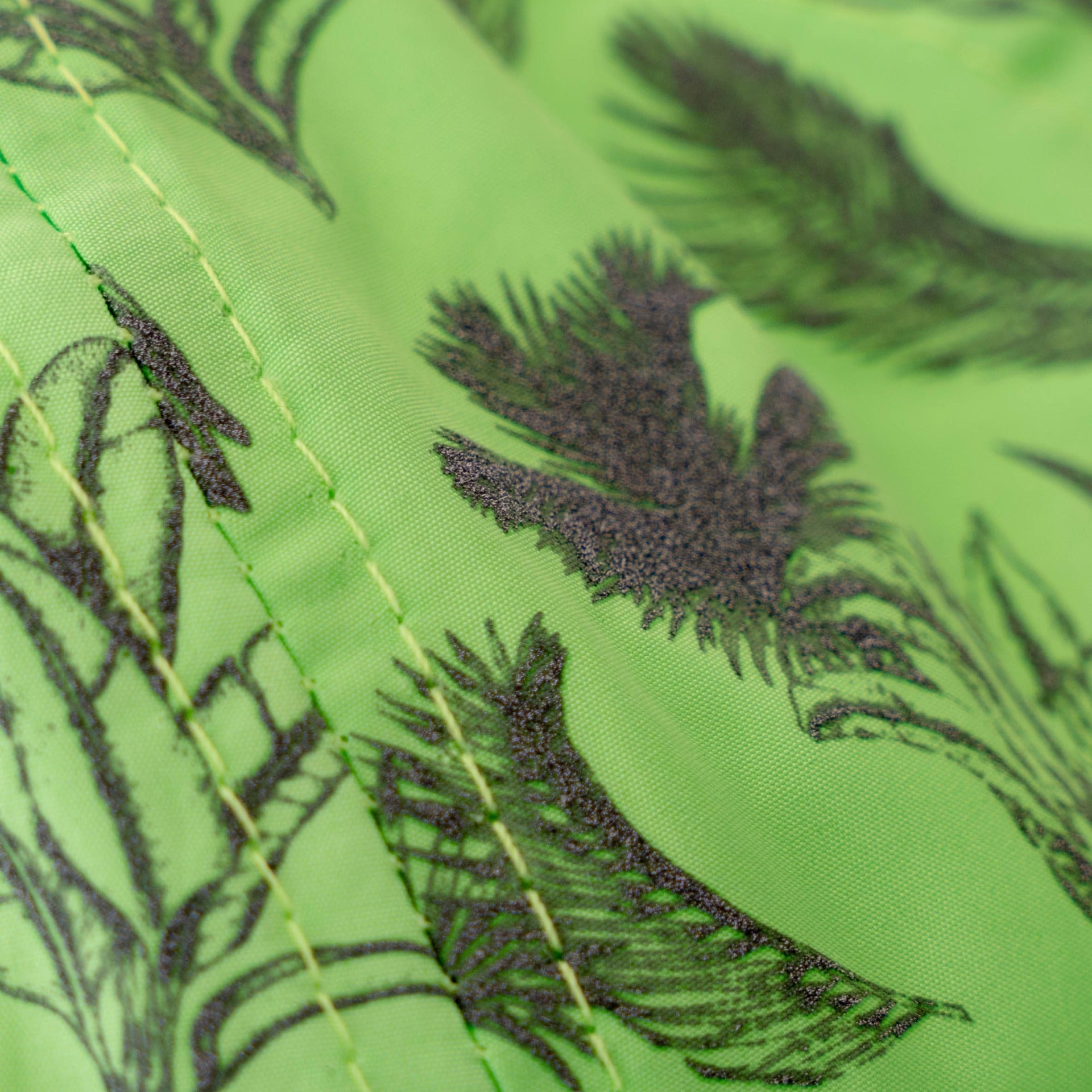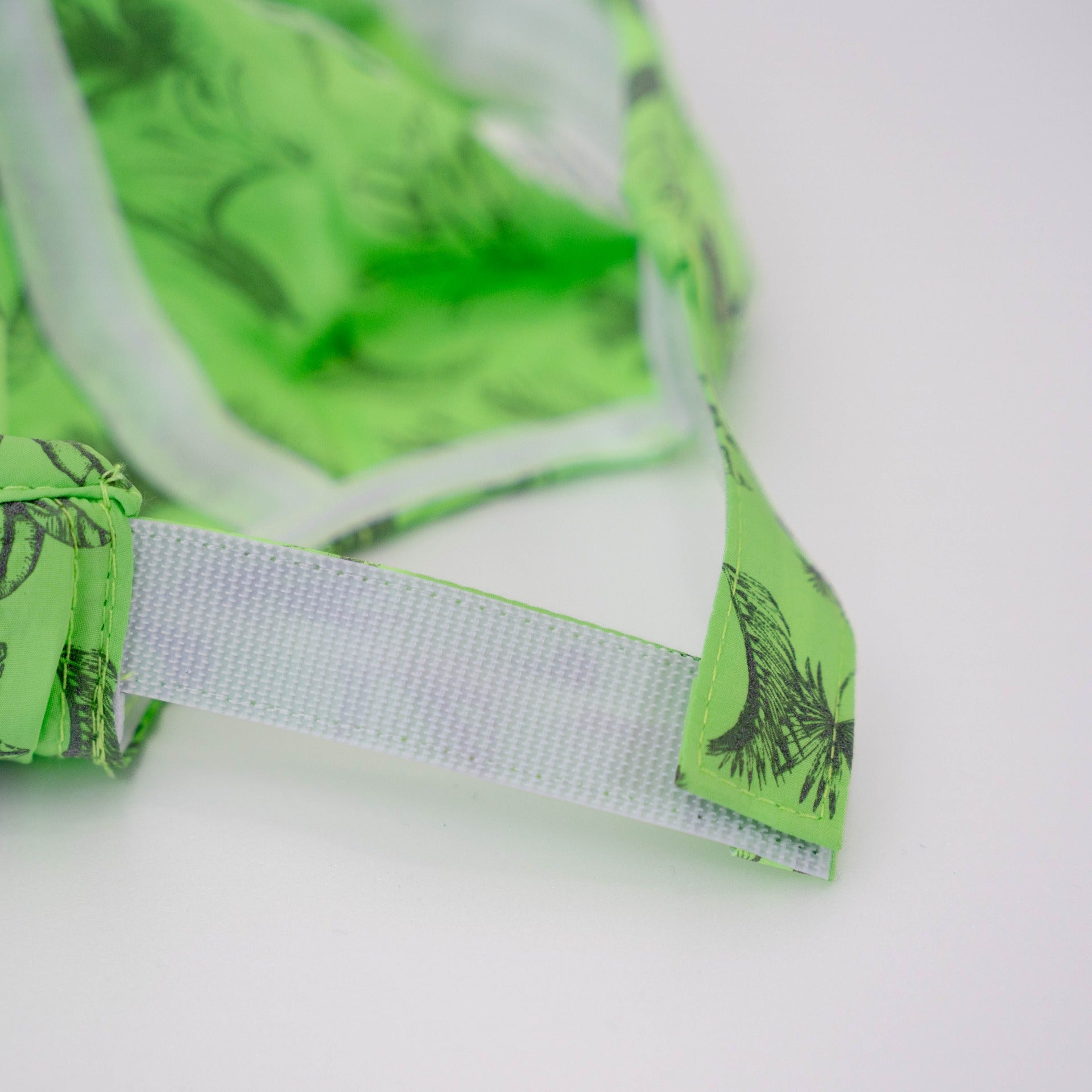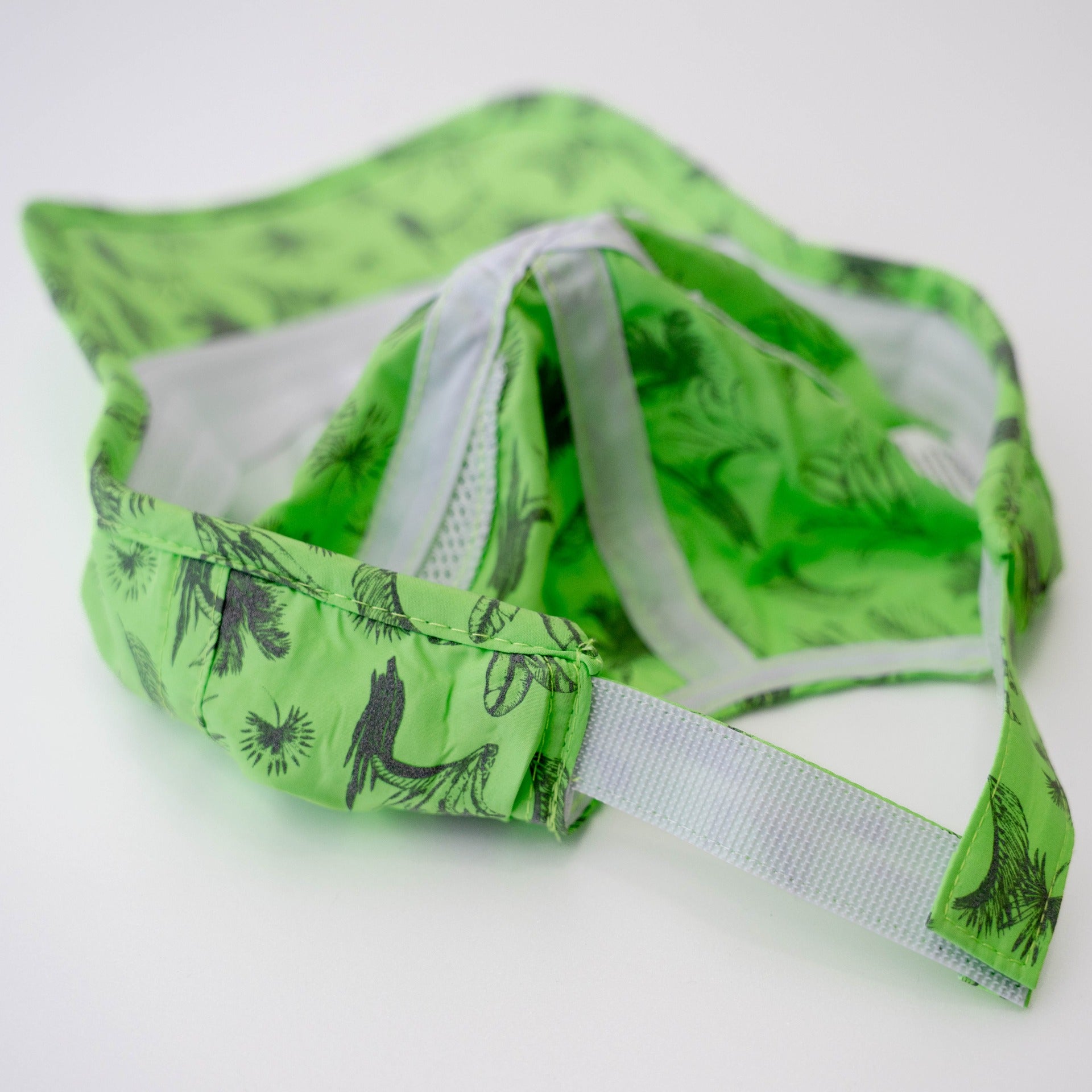 ジャングルの色々な葉がデザインされた、ライトグリーンが爽やかなキャップ。葉のデザインが光が当たると反射するリフレクタープリント。