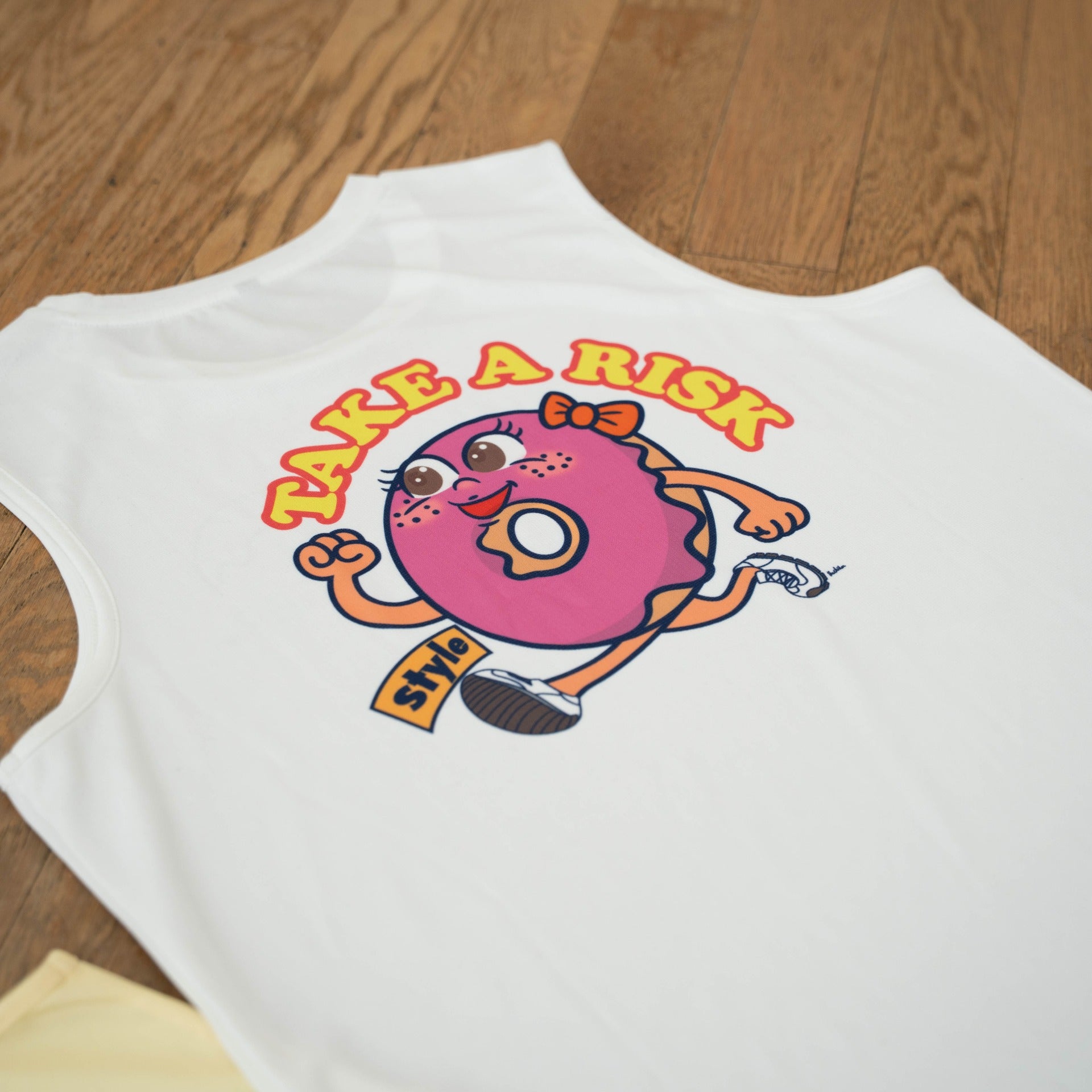 Style | DONUTS "TAKE A RISK" Sleeve-less Tee by JINGER (Men's White)