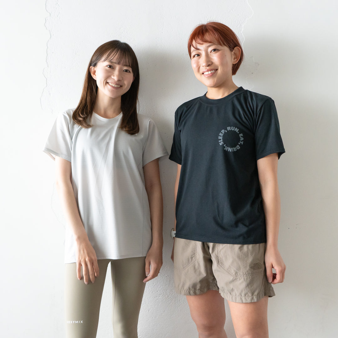 メイン素材はリサイクルナイロンを使用したナチュラルな風合いの布帛生地。ポリプロピレンを配した肌面の生地は、肌離れもよくドライ感が持続します。