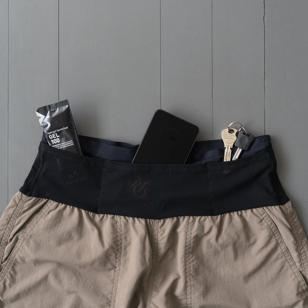 ウエスト部はドライタッチなトリコット素材を採用し、前と後ろに合計6つのストレッチメッシュポケットを配置。スマートフォンや防寒用のジャケットなどが収納でき、パックを背負う必要がないシチュエーションで重宝します。