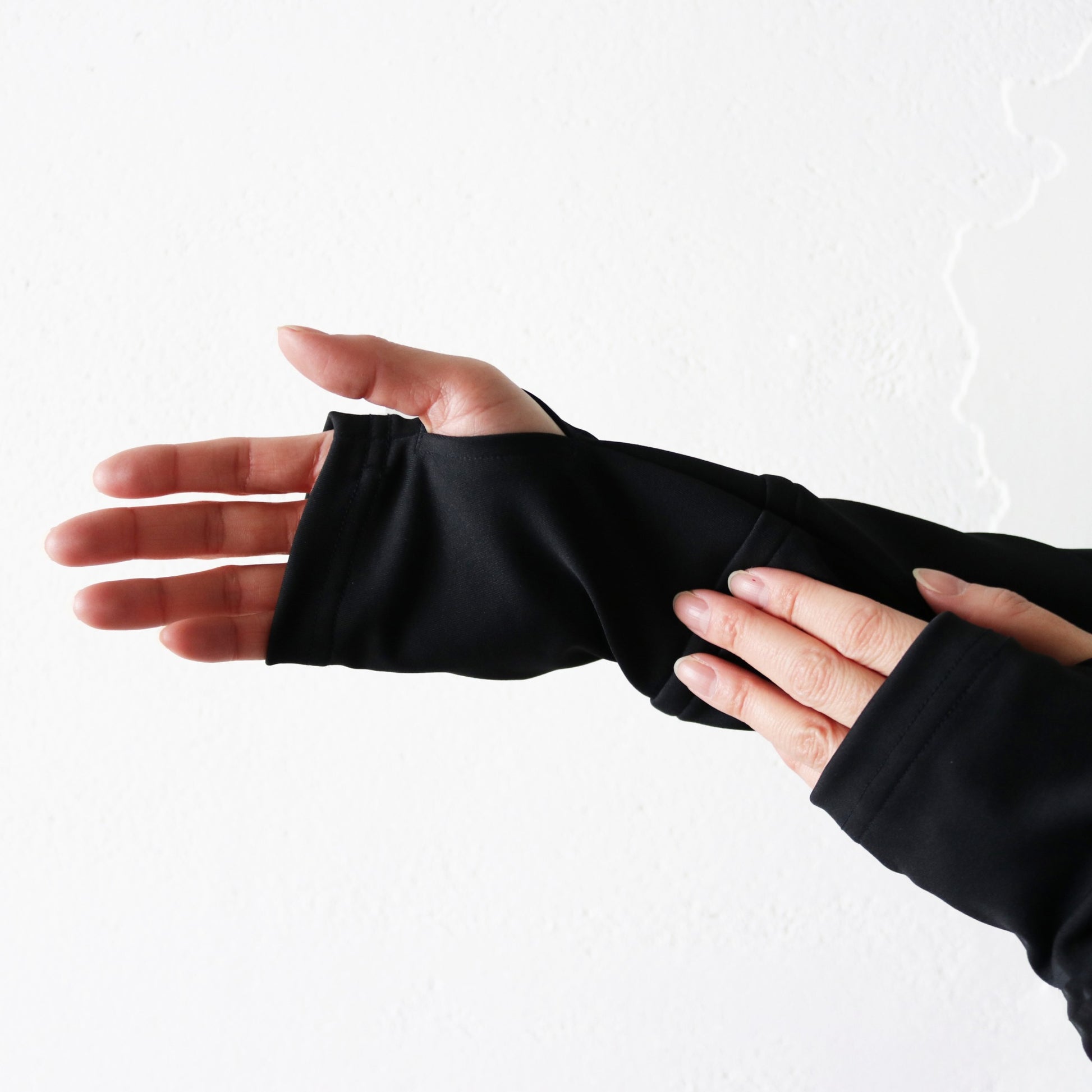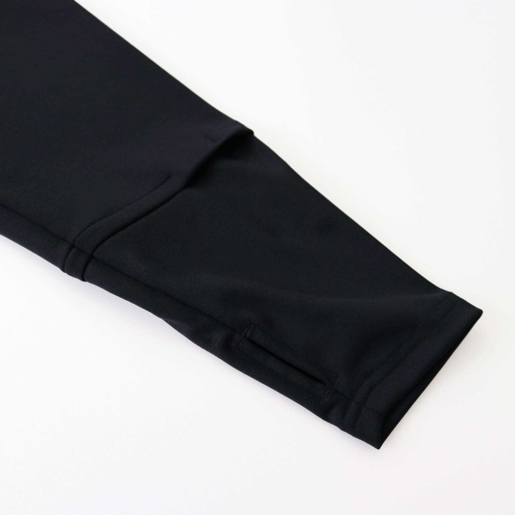 アイテムのボディ全体は4方向に伸縮するストレッチ素材、そして肘から先は別生地での切り返し。柔らかいポリウレタン配合のストレッチ素材を採用することにより、ランニング時の腕振りをスムーズにサポート。さらに手の甲まで収まるロングスリーブによってこれ1枚で手先の寒さに耐えられる仕様に。