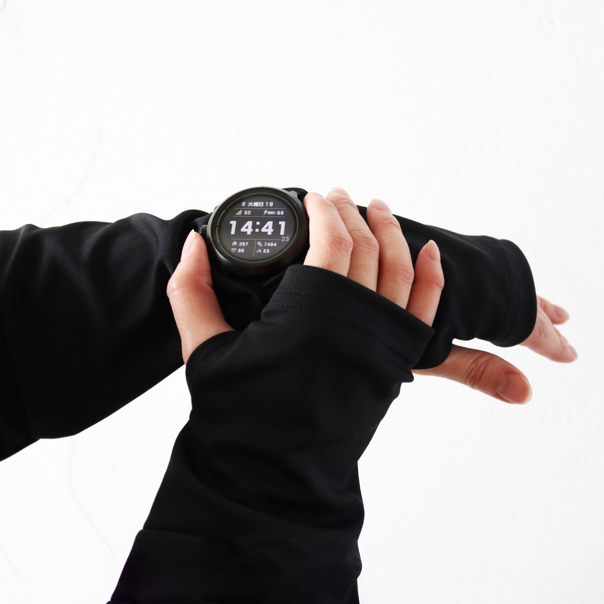 また、これにより塞がってしまった手首に必須のランニングウォッチを直接つけたまま(つまり心拍数等の計測を行ったまま)ウォッチフェイスを目視できるウィンドウを用意し、秋冬に走り込みたいランナーのニーズをフルサポートするスリーブへ。左右にウォッチウィンドウを装備し、