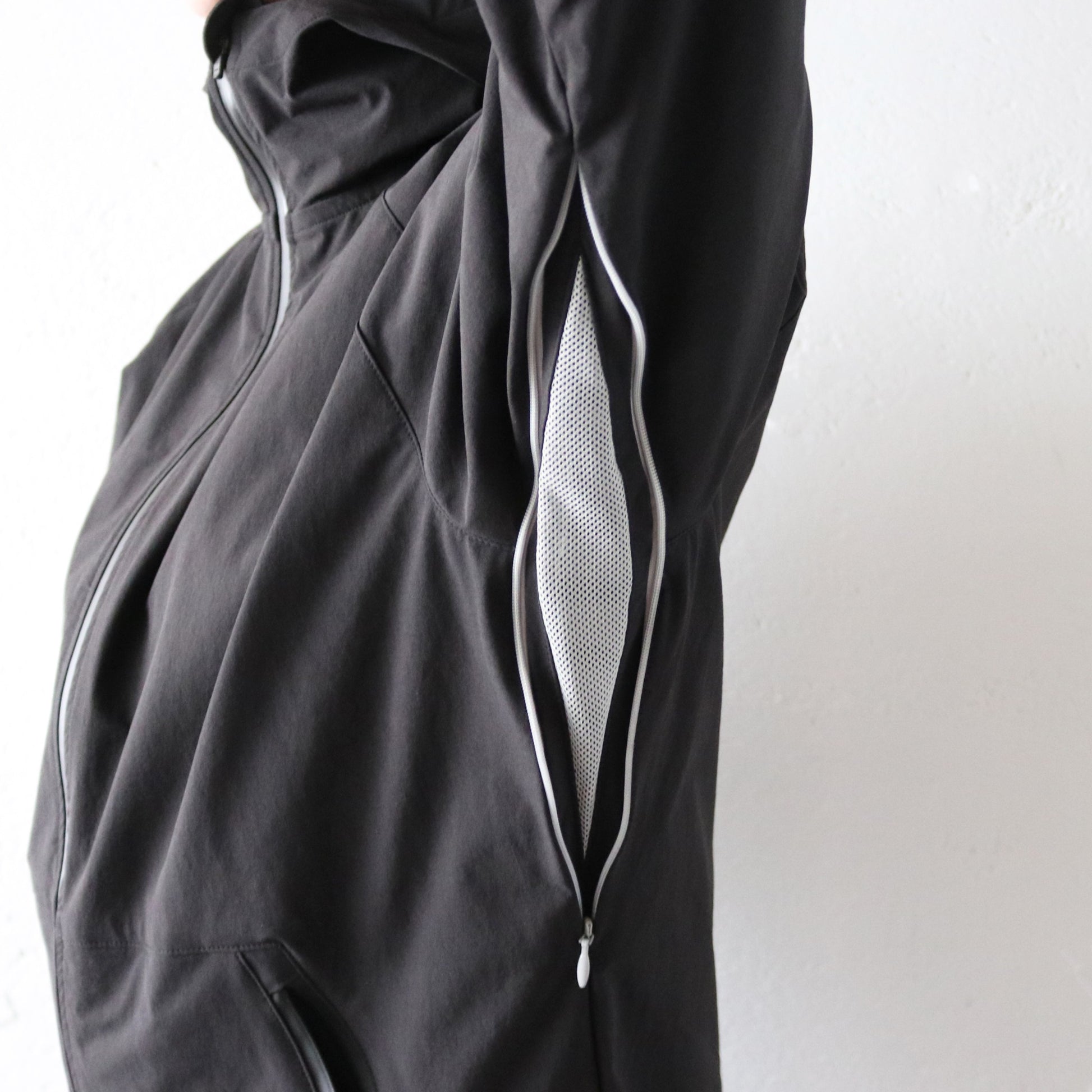脇下に通気性に配慮した開閉式のファスナーベンチレーションを搭載。メッシュ生地のベンチレーションがランニングで汗をかいた時や、湿気が多い季節でもジャケット内の蒸れや熱を逃してくれるので快適。