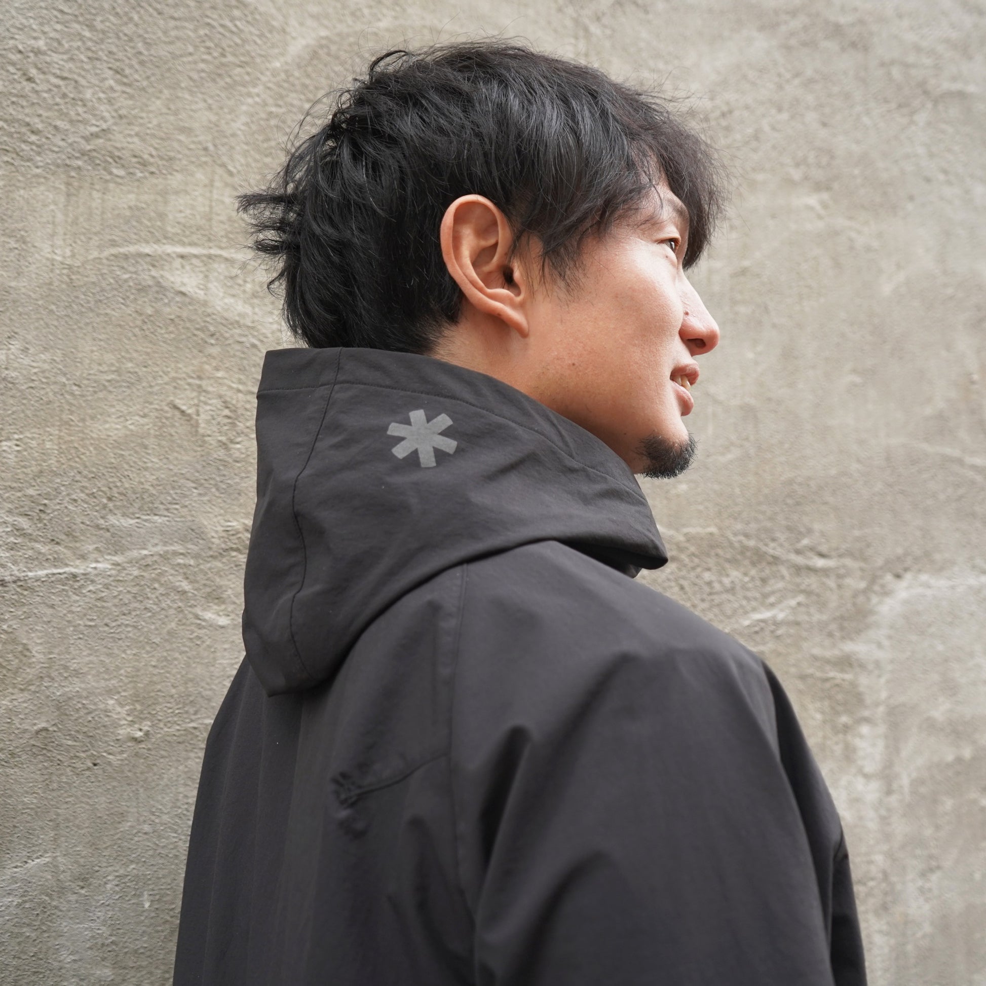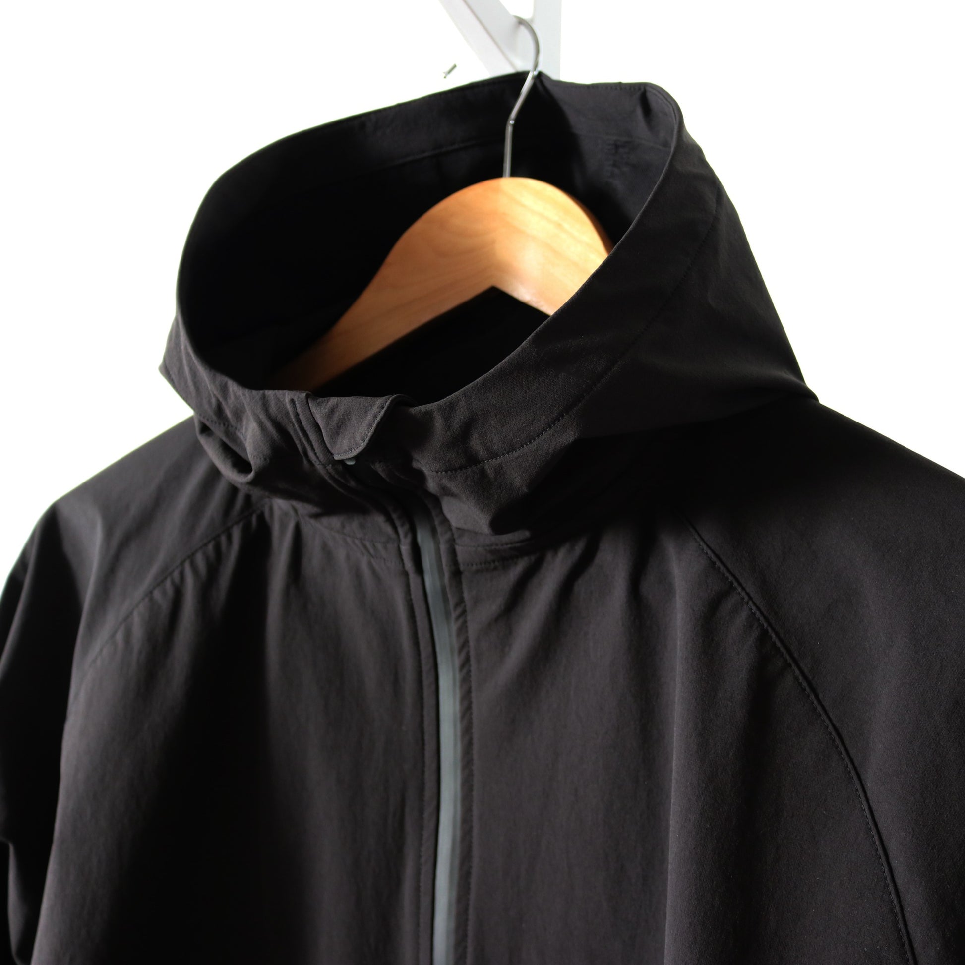 ハリのある素材がフードの立ち上がりをキープしてくれ、首元のファスナーを開けても様になるデザイン。