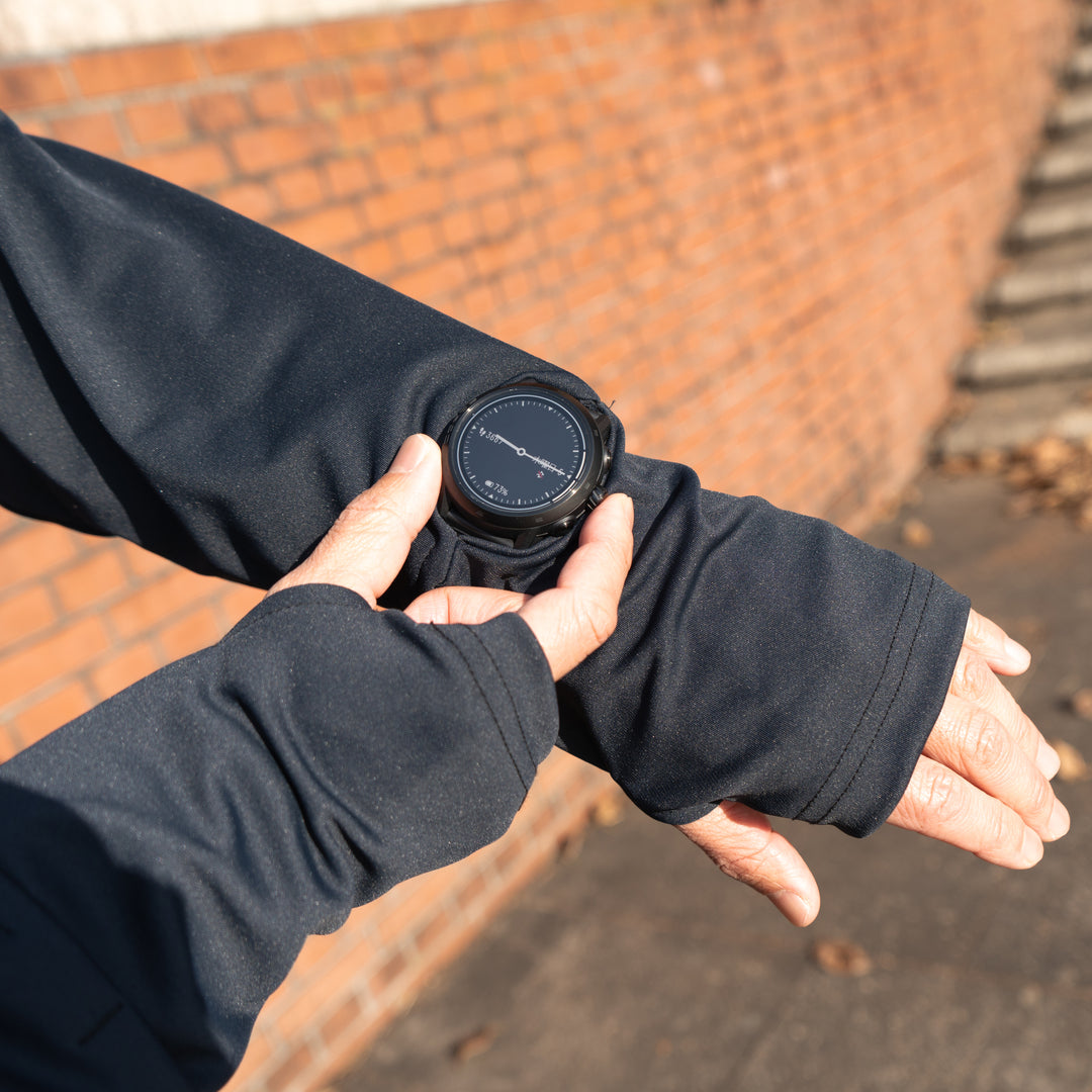 手首に必須のランニングウォッチを直接つけたまま(つまり心拍数等の計測を行ったまま)ウォッチフェイスを目視できるウィンドウを用意し、秋冬に走り込みたいランナーのニーズをフルサポートするスリーブへ。左右にウォッチウィンドウを装備し、ウォッチ